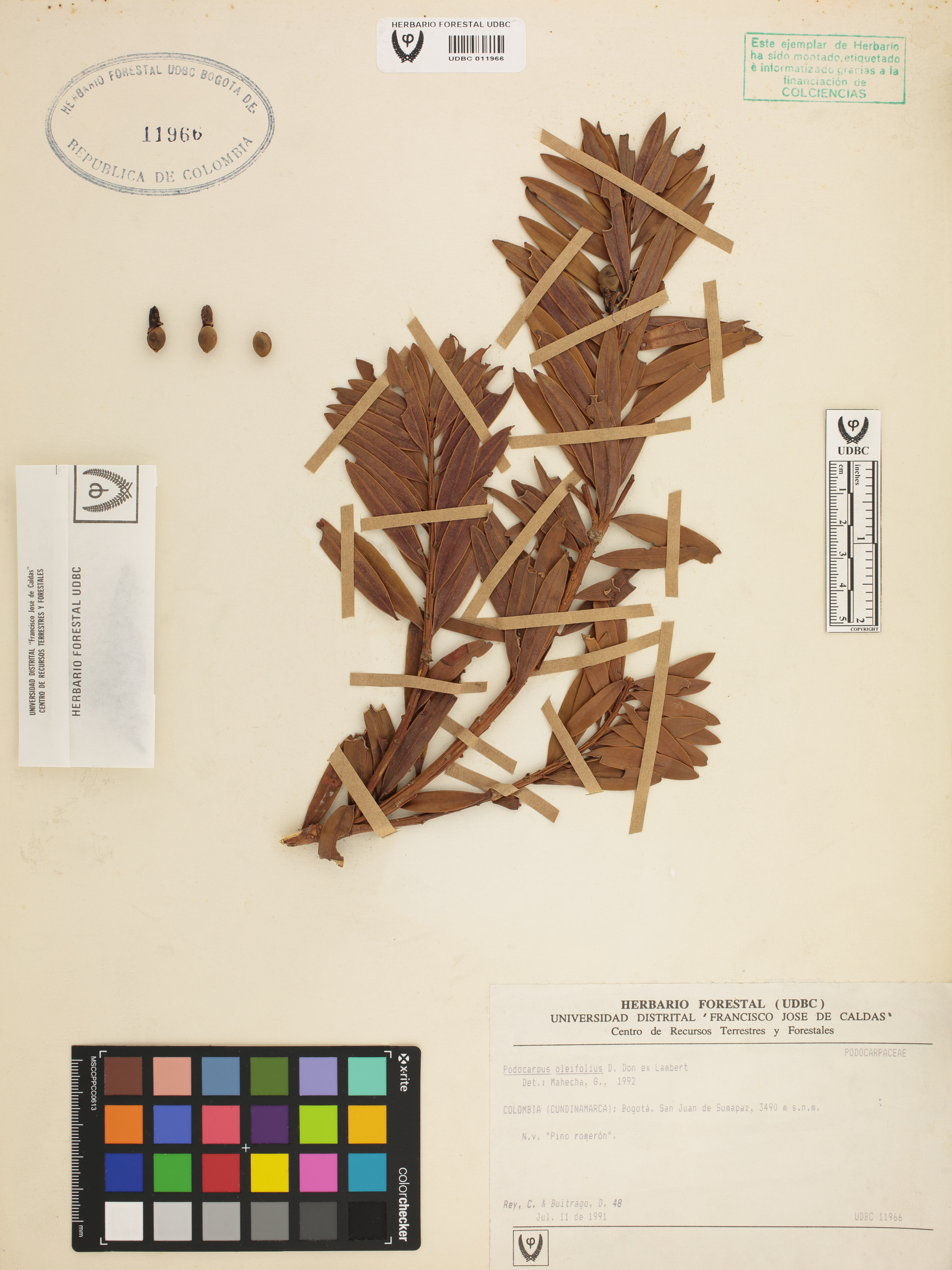 Fotografía del ejemplar Rey, C. 48, determinado como Podocarpus oleifolius en el año 1992