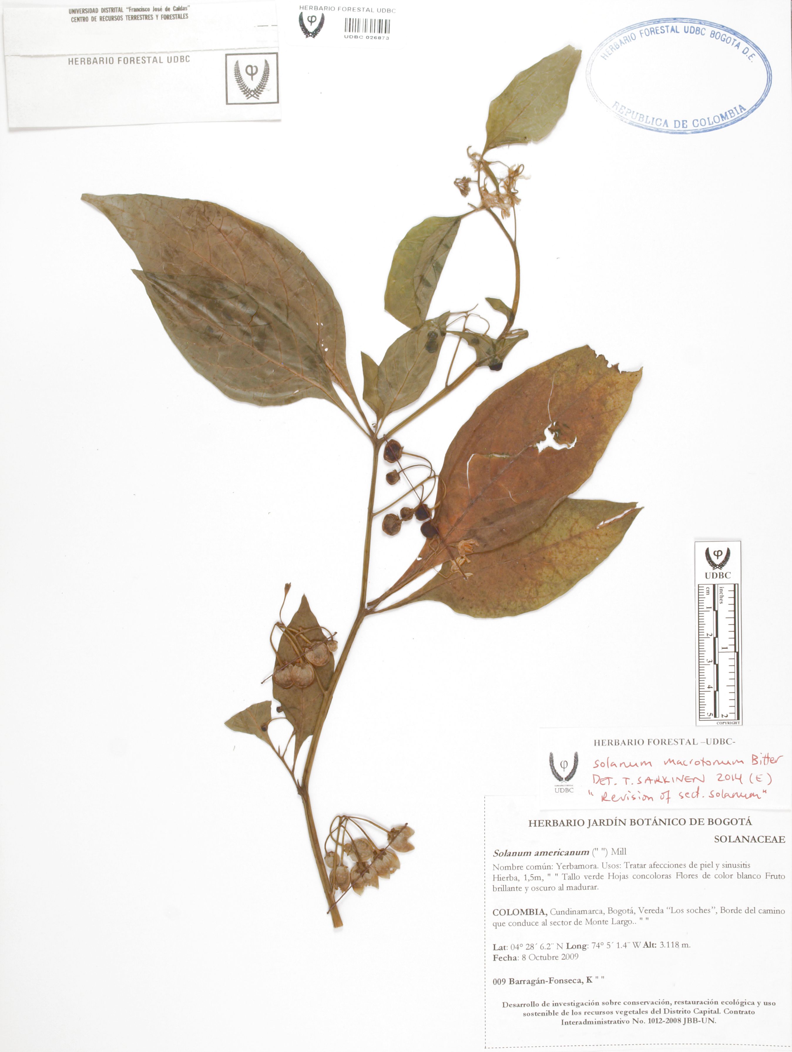 Fotografía del ejemplar Barragán-Fonseca, K. 9, determinado como Solanum macrotonum en el año 2014