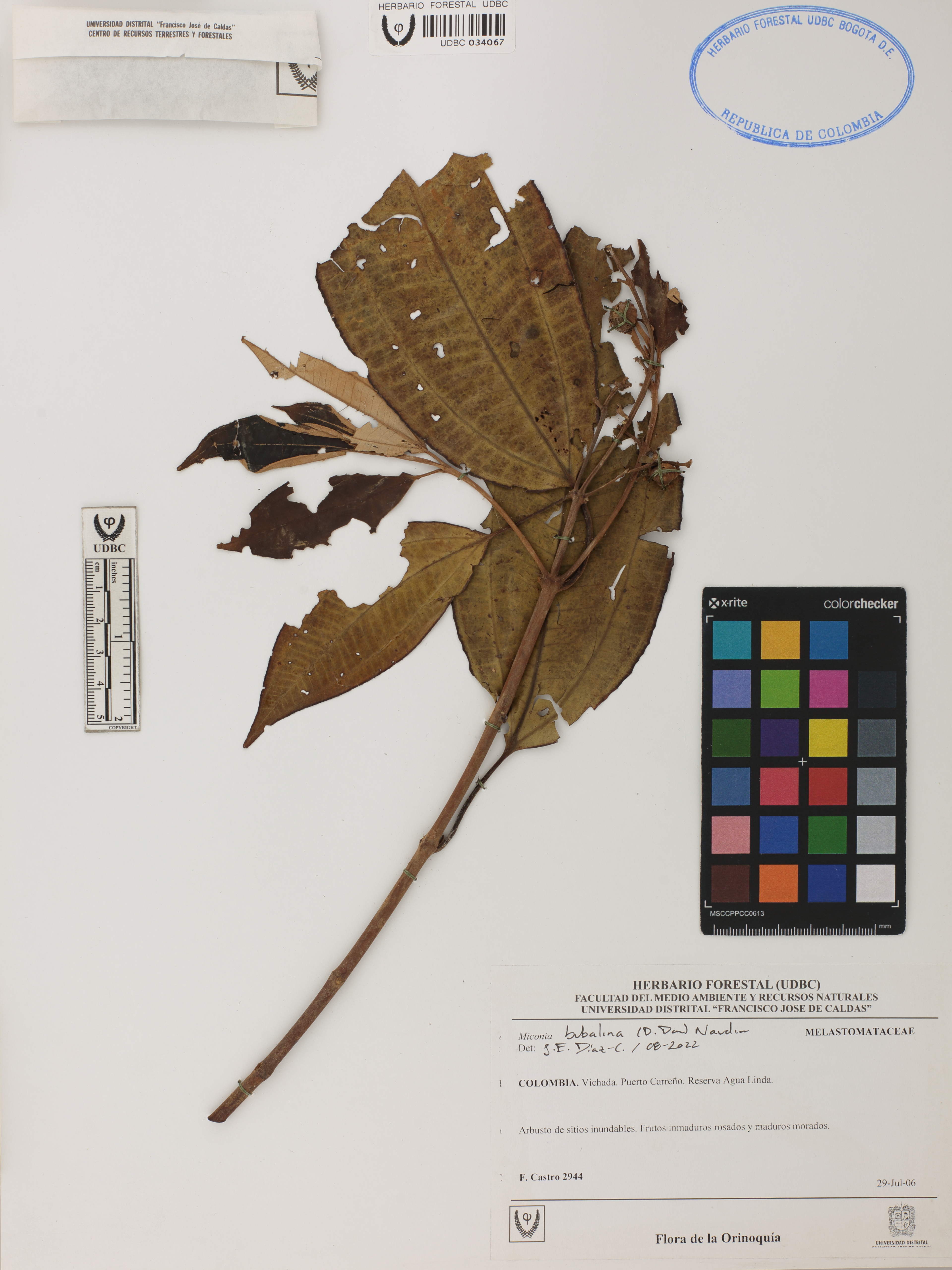 Fotografía del ejemplar Castro, F. 2944, determinado como Miconia bubalina en el año 2022