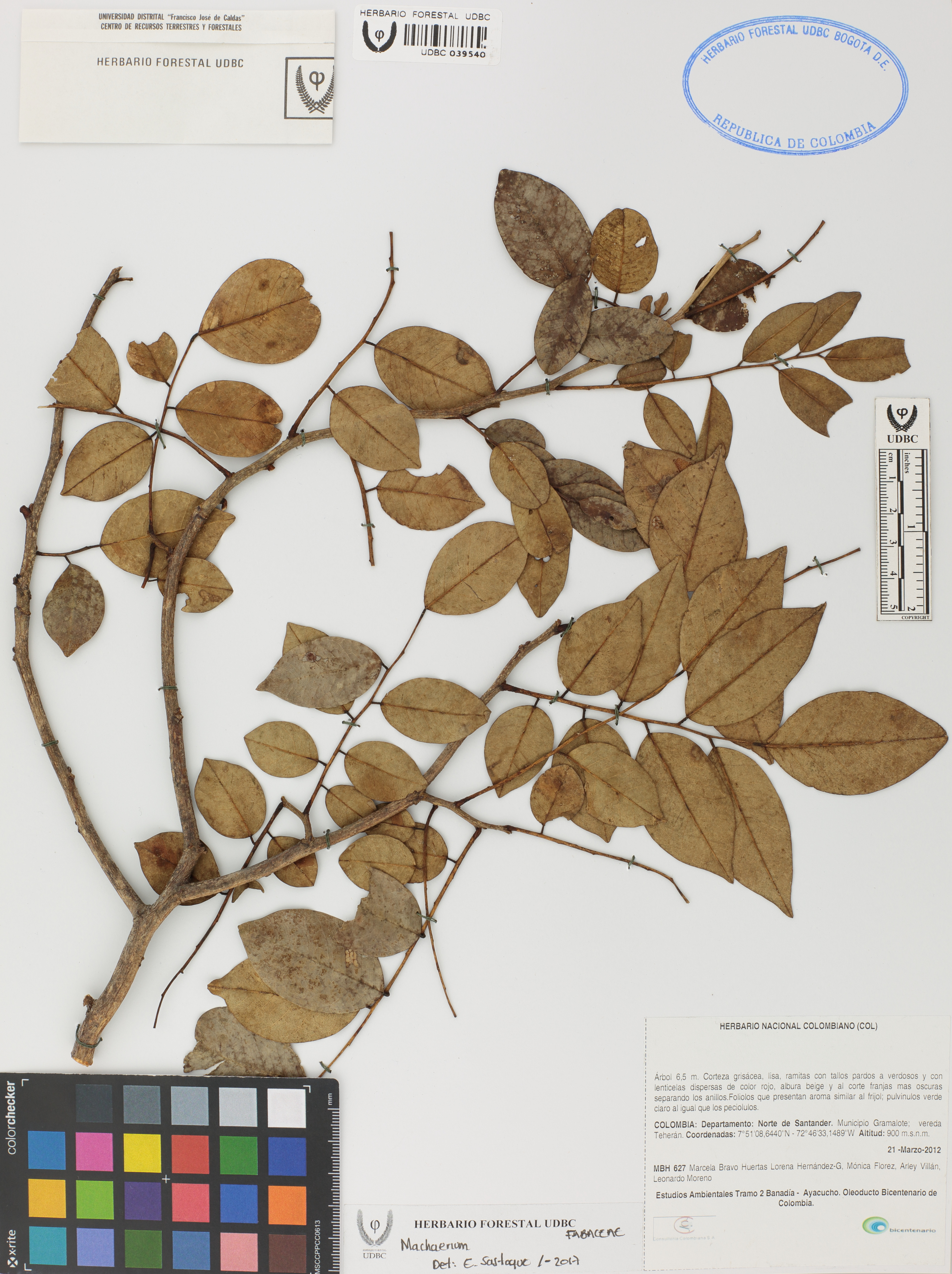 Fotografía del ejemplar Bravo, M. 627, determinado como Machaerium sp. en el año 2017