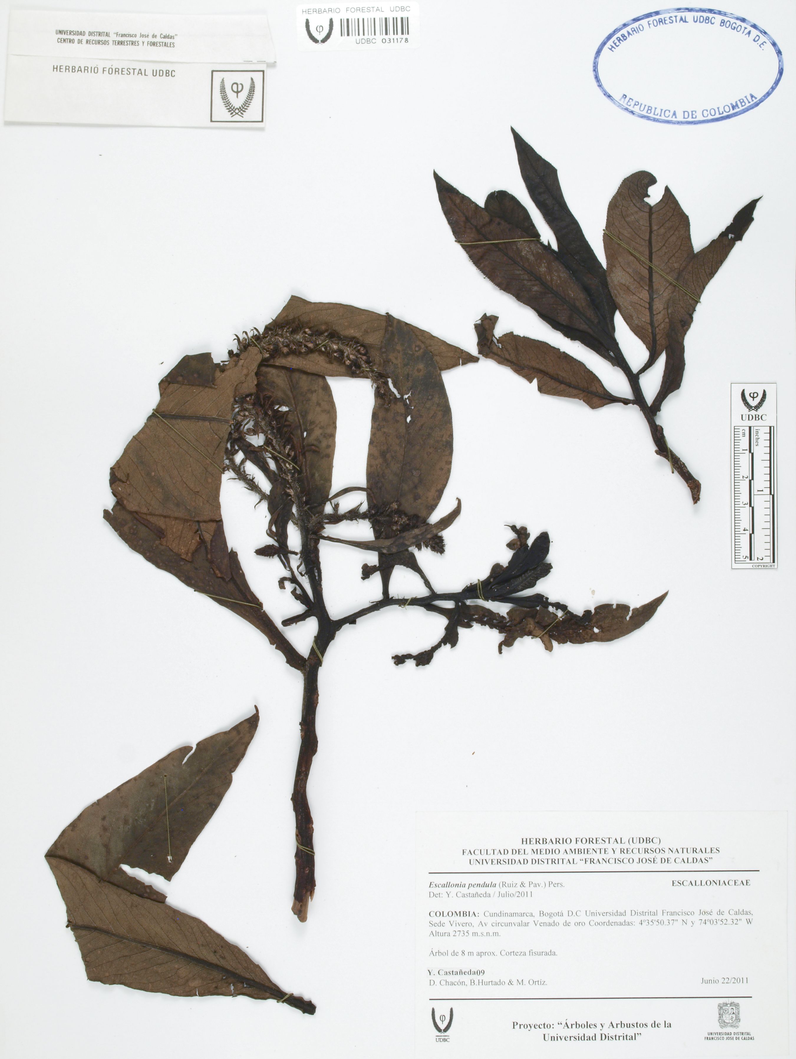 Fotografía del ejemplar Castañeda, Y. 9, determinado como Escallonia pendula en el año 2011