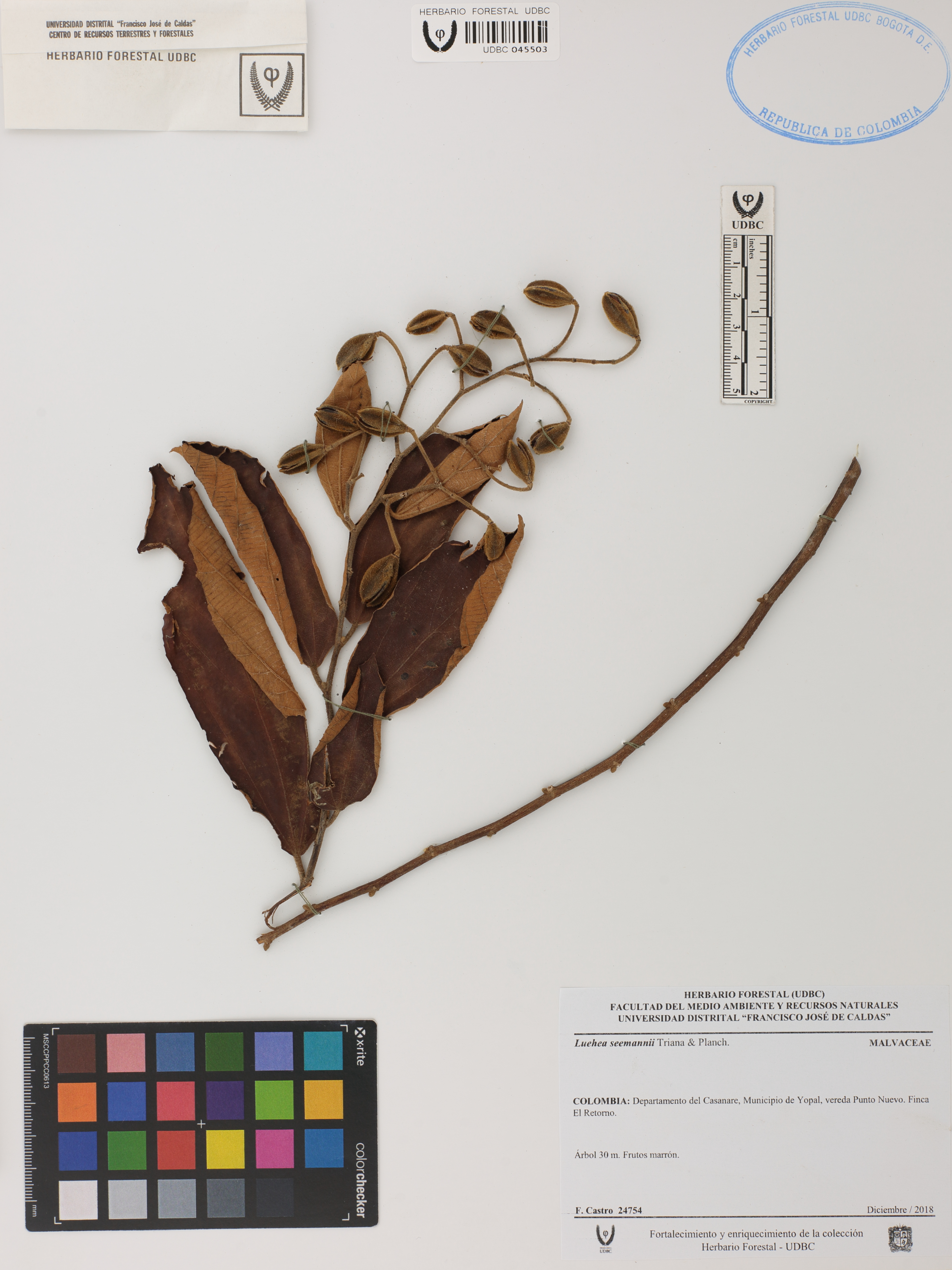 | dc.description | Fotografía del ejemplar Castro, F. 24754, determinado como Luehea seemannii en el año 2018 | |