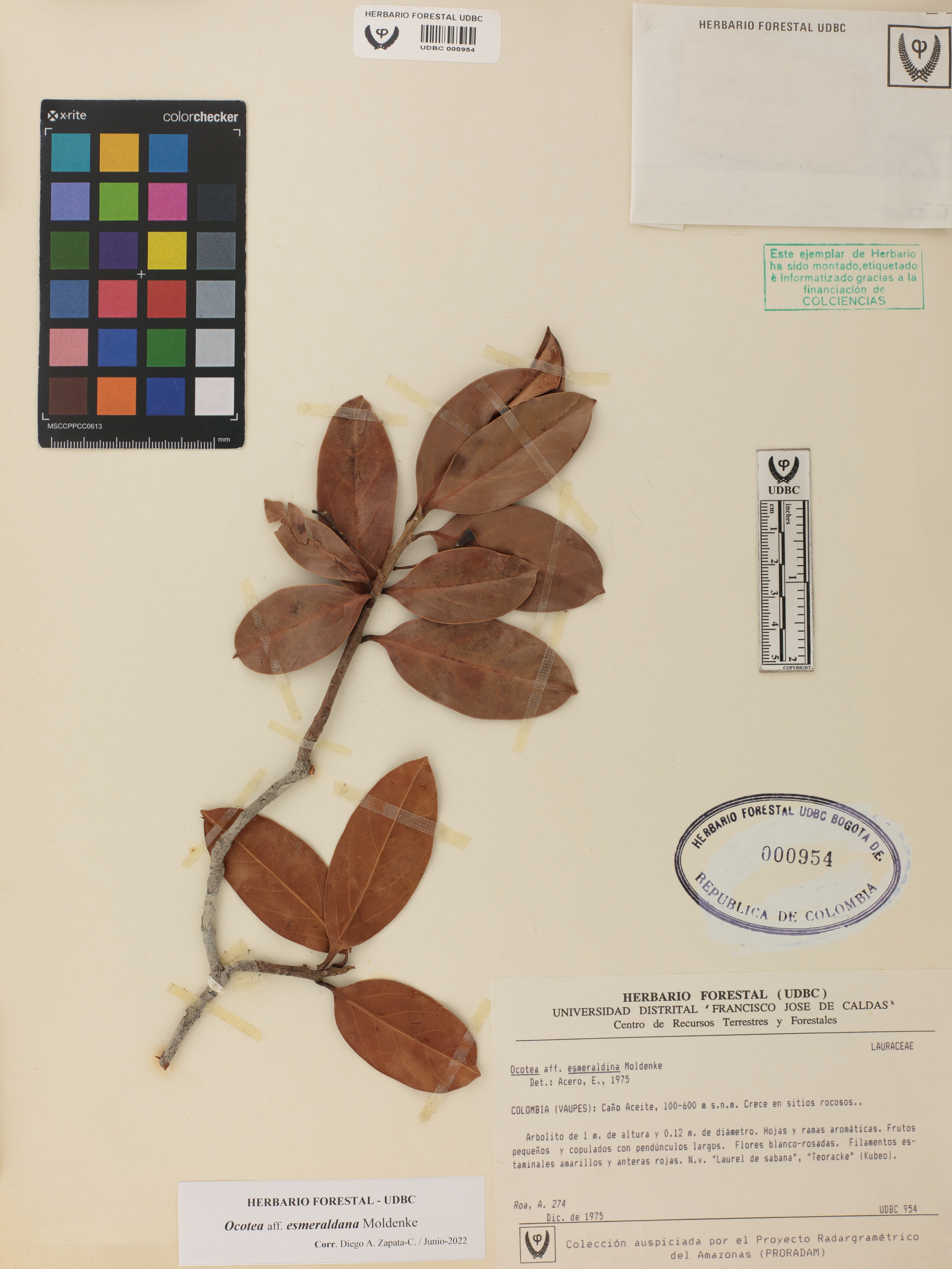 | dc.description | Fotografía del ejemplar Roa, A. 274, determinado como Ocotea esmeraldana en el año 1975 | |