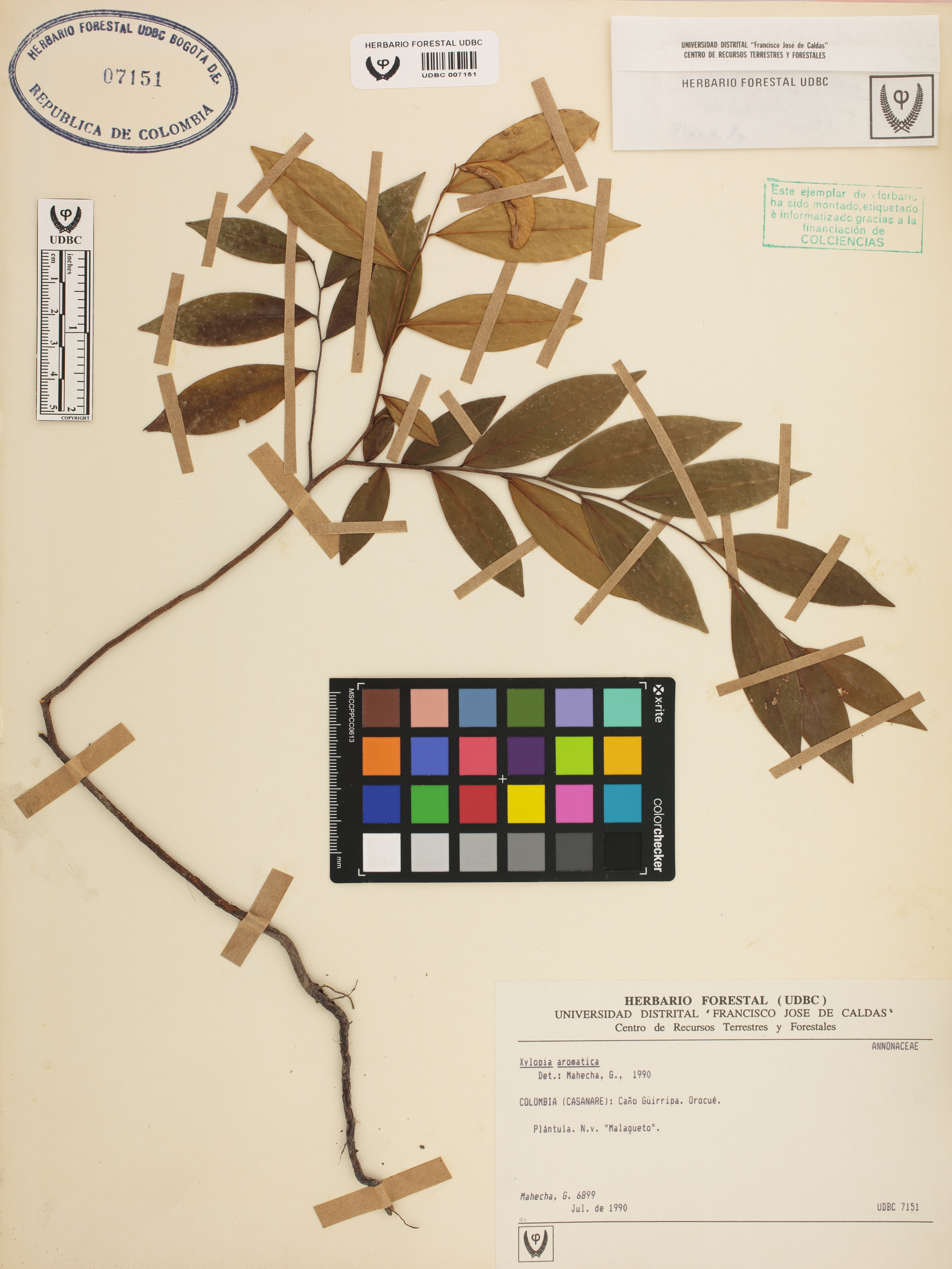 Fotografía del ejemplar Mahecha, G. 6899, determinado como Xylopia aromatica en el año 1990