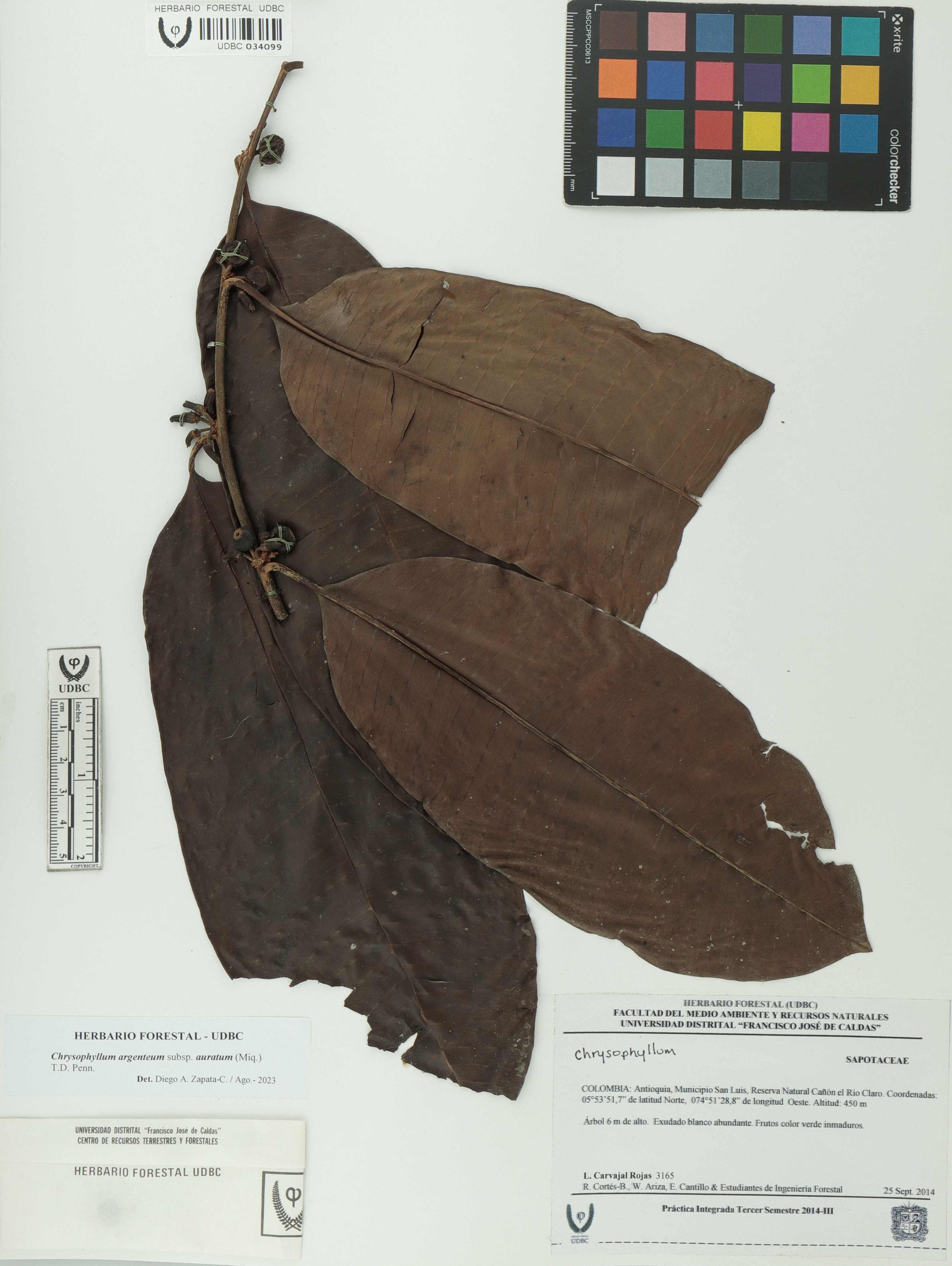 Fotografía del ejemplar Carvajal, L. 3165, determinado como Chrysophyllum argenteum subsp. auratum en el año 2023