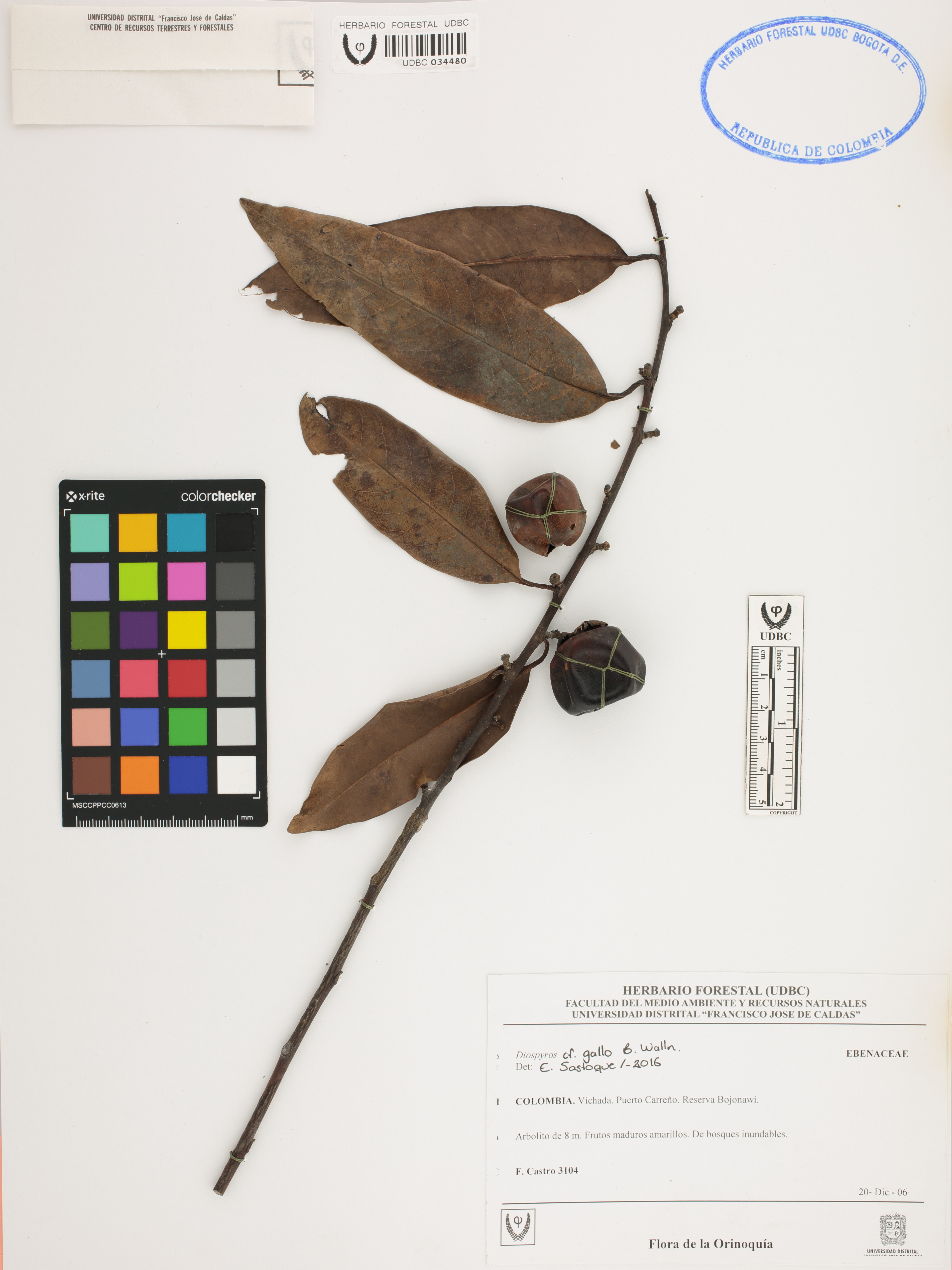 Fotografía del ejemplar Castro, F. 3104, determinado como Diospyros gallo en el año 2016