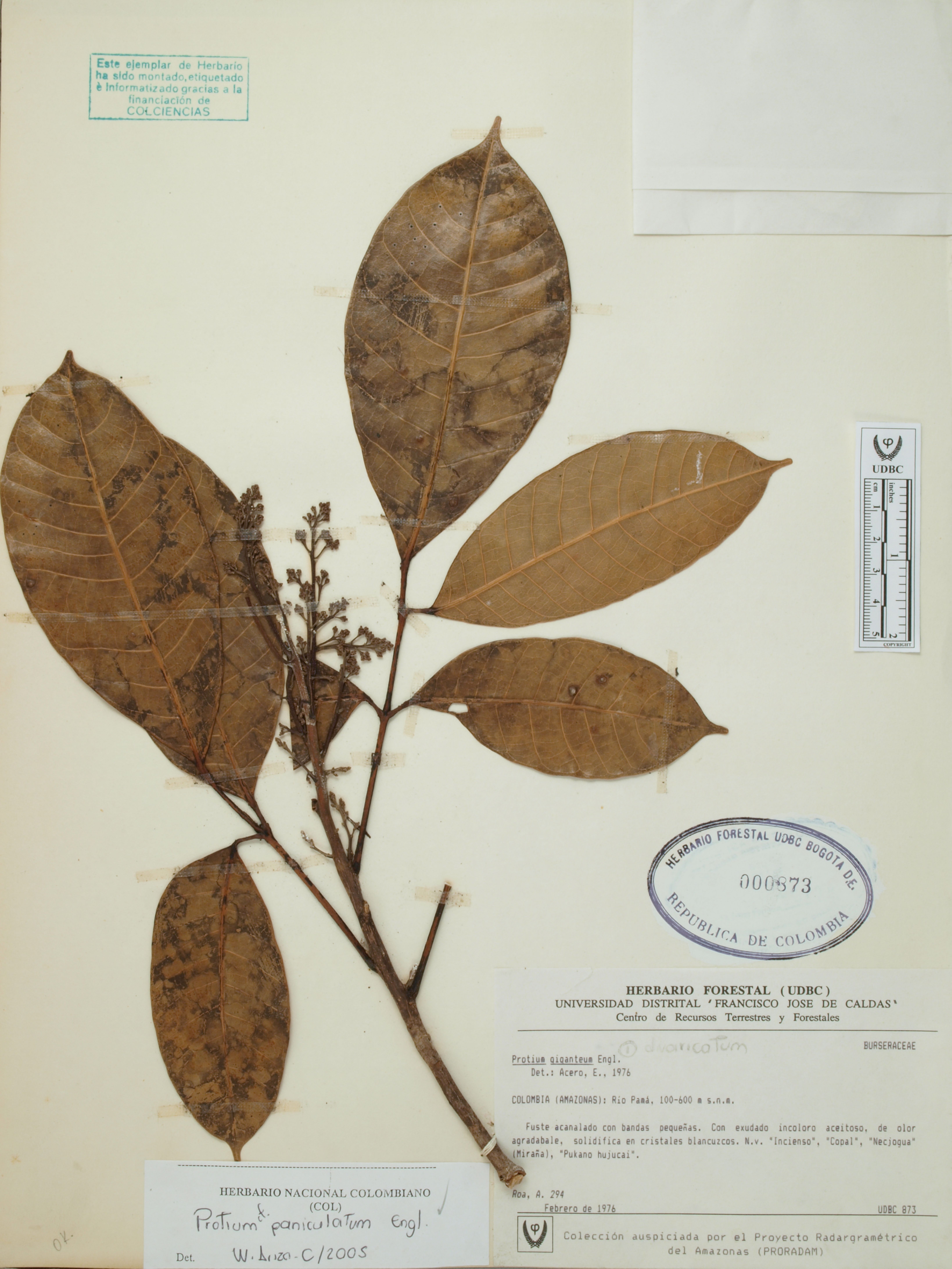 Fotografía del ejemplar Roa, A. 294, determinado como Protium paniculatum en el año 2005