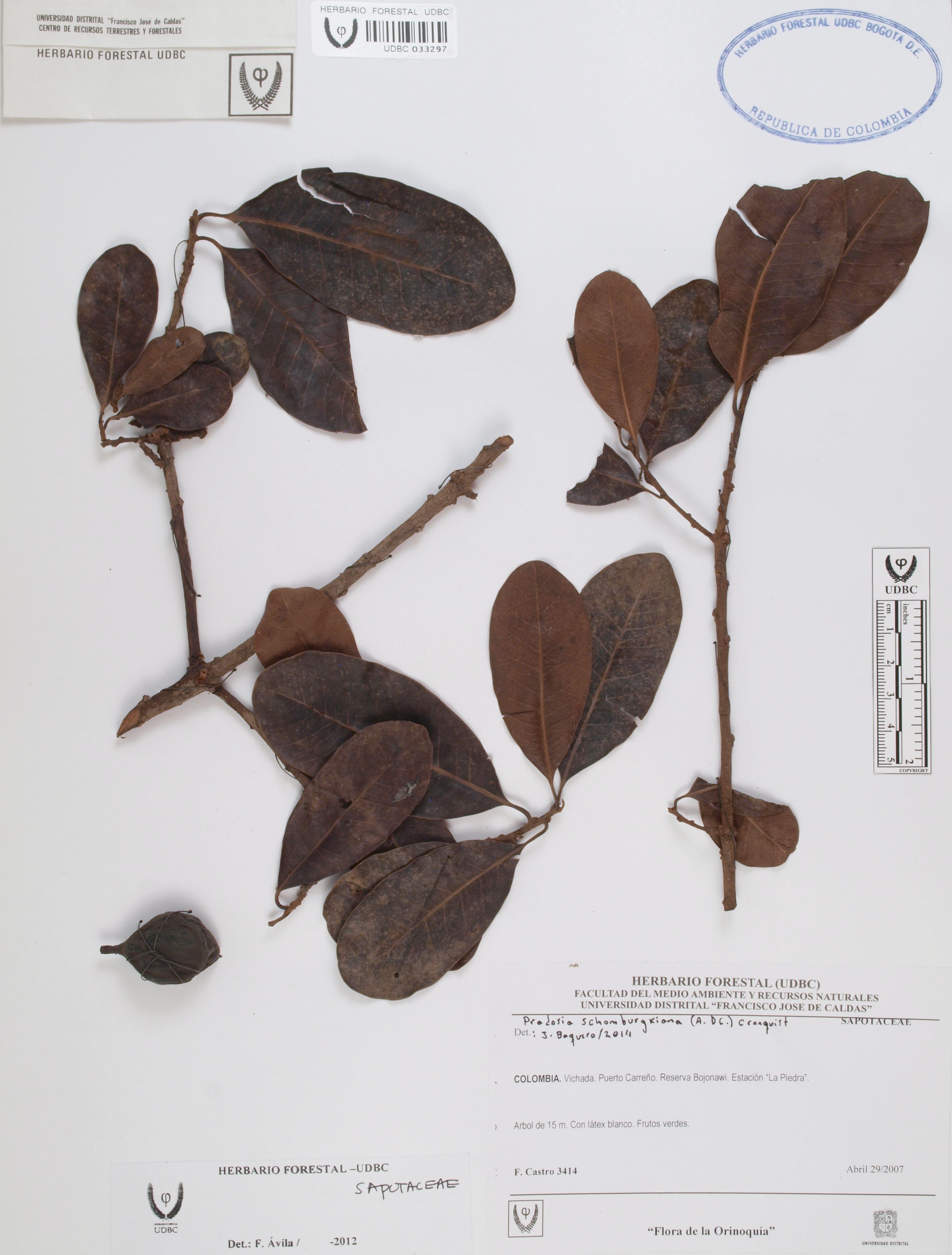 Fotografía del ejemplar Castro, F. 3414, determinado como Pradosia schomburgkiana en el año 2014