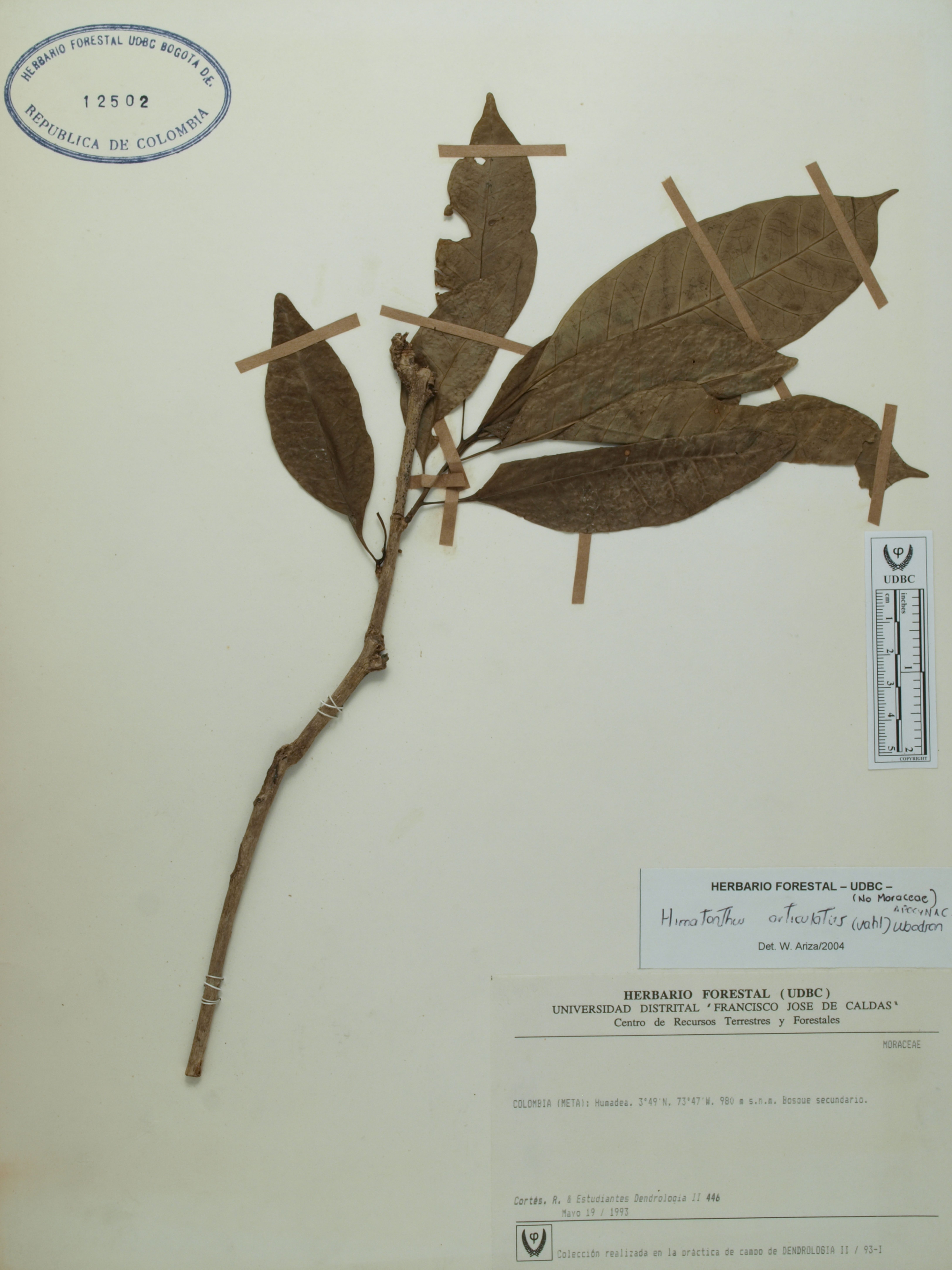 | dc.description | Fotografía del ejemplar Cortés-B., R. 446, determinado como Himatanthus articulatus en el año 2004 | |