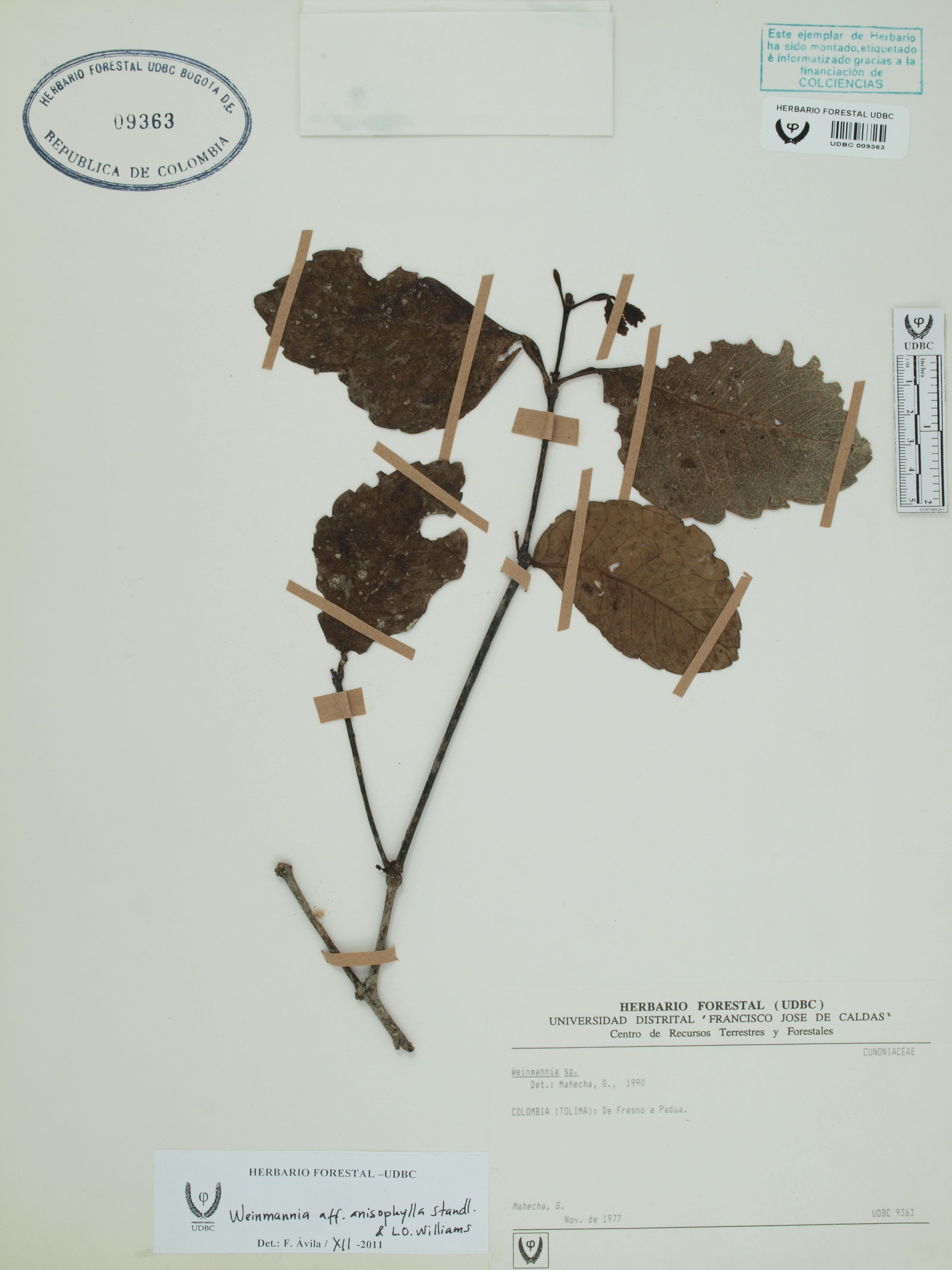 Fotografía del ejemplar Mahecha, G., determinado como Weinmannia anisophylla en el año 2011