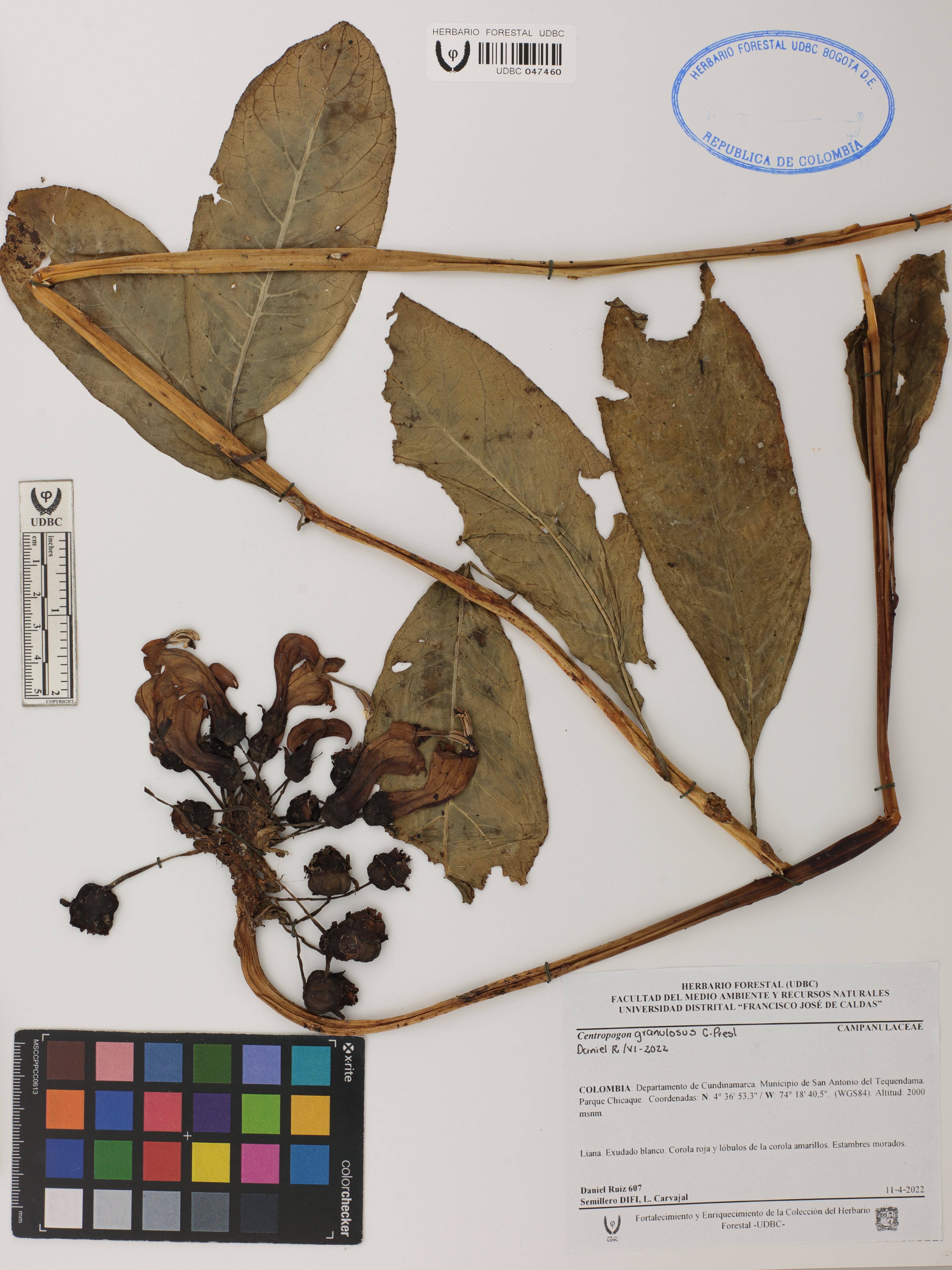 Fotografía del ejemplar Ruiz, Daniel 607, determinado como Centropogon granulosus en el año 2022
