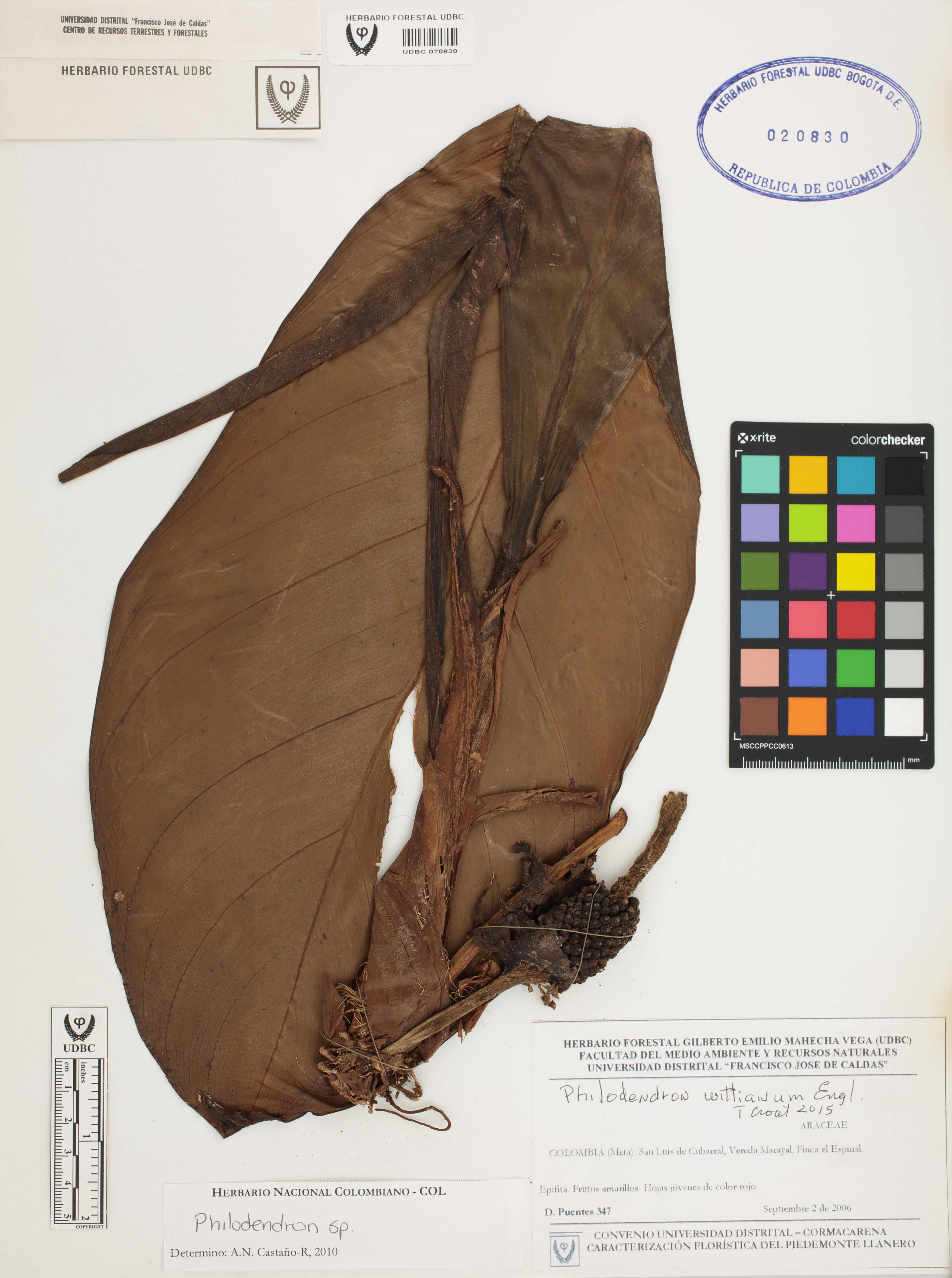 Fotografía del ejemplar Puentes, D. 347, determinado como Philodendron wittianum en el año 2015