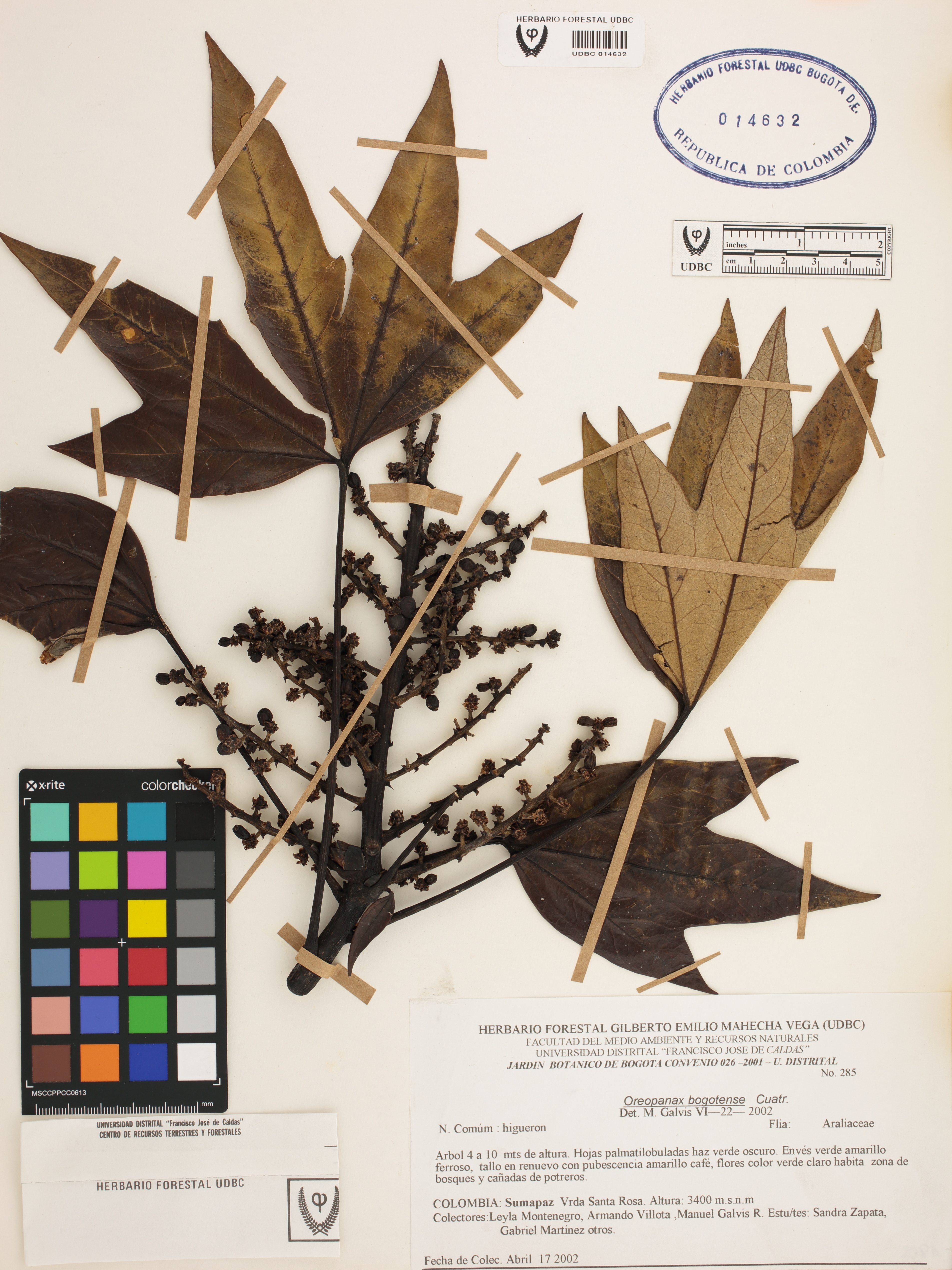 Fotografía del ejemplar Montenegro, L. 285, determinado como Oreopanax bogotensis en el año 2002
