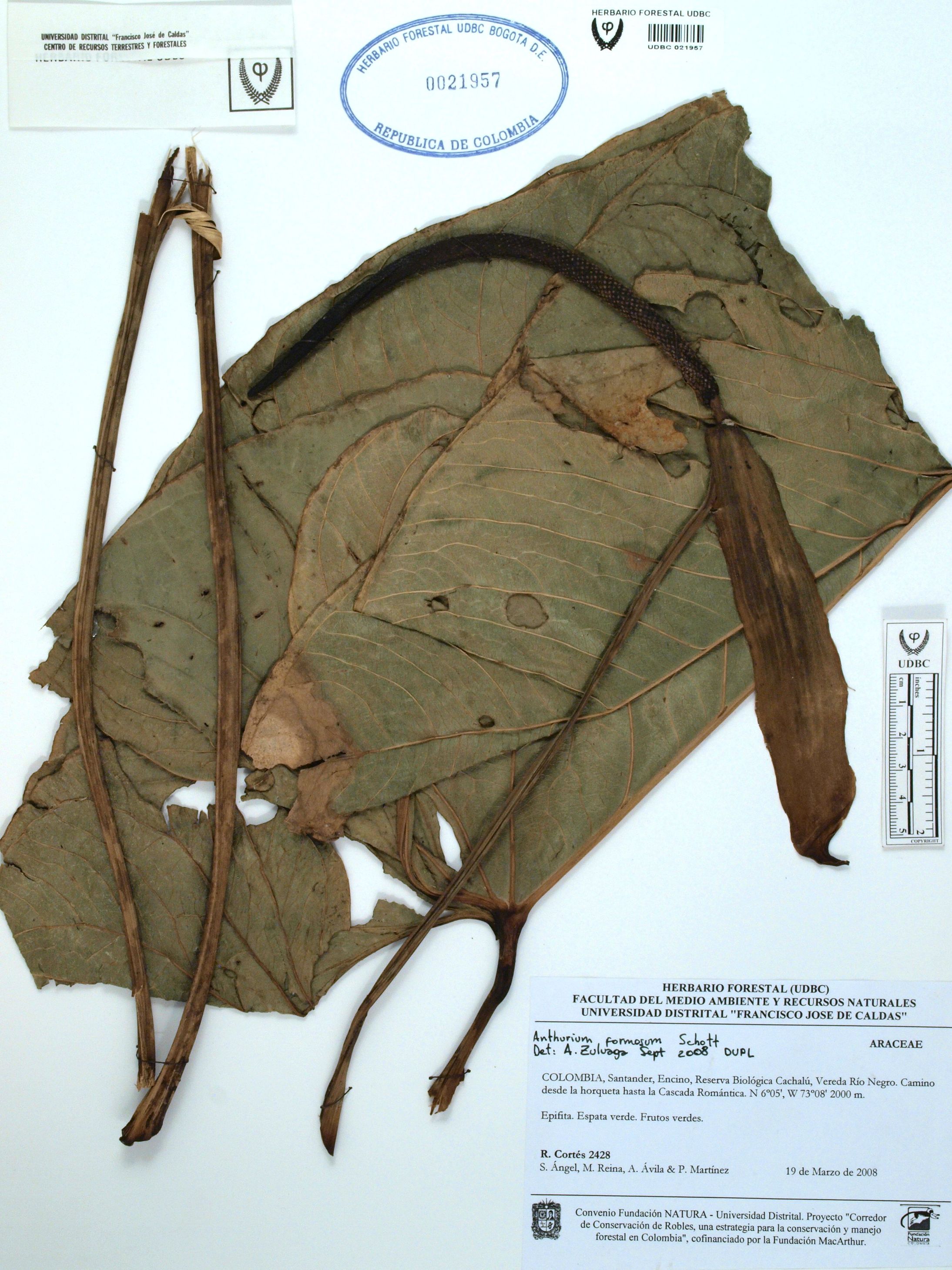 Fotografía del ejemplar Cortés, R. 2428, determinado como Anthurium formosum en el año 2008