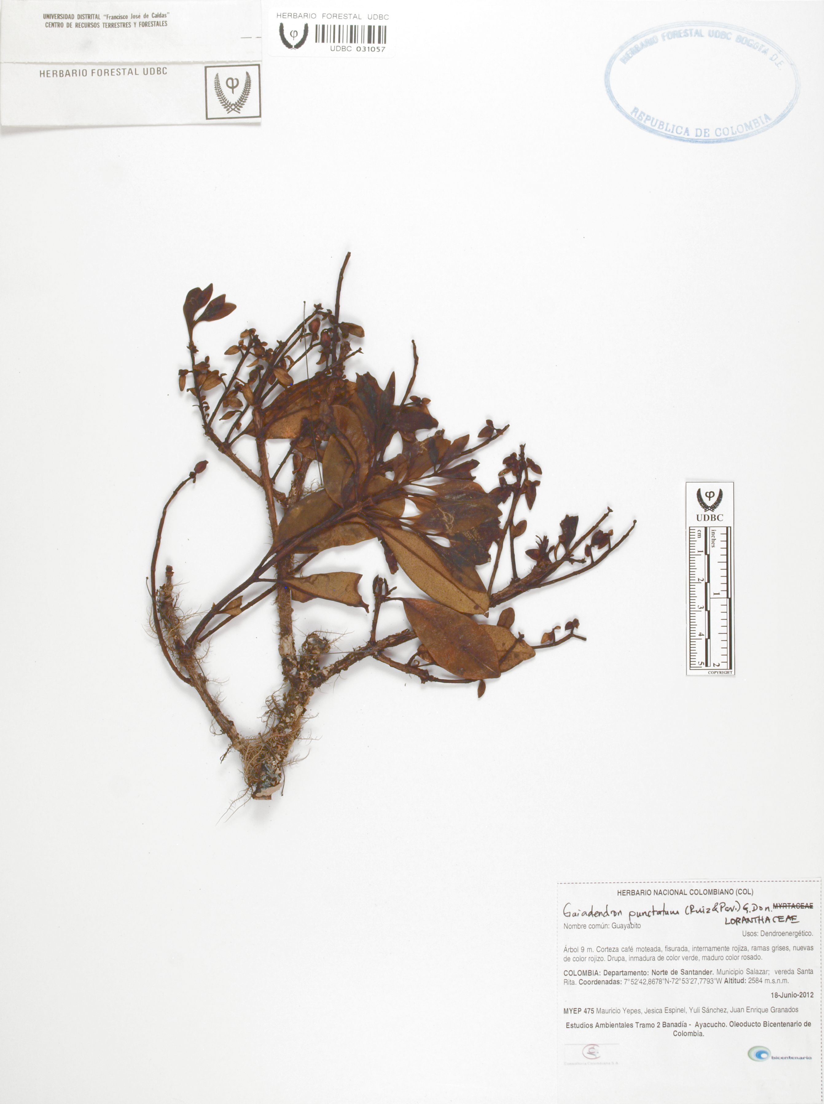 Fotografía del ejemplar Yepes, M. 475, determinado como Gaiadendron punctatum