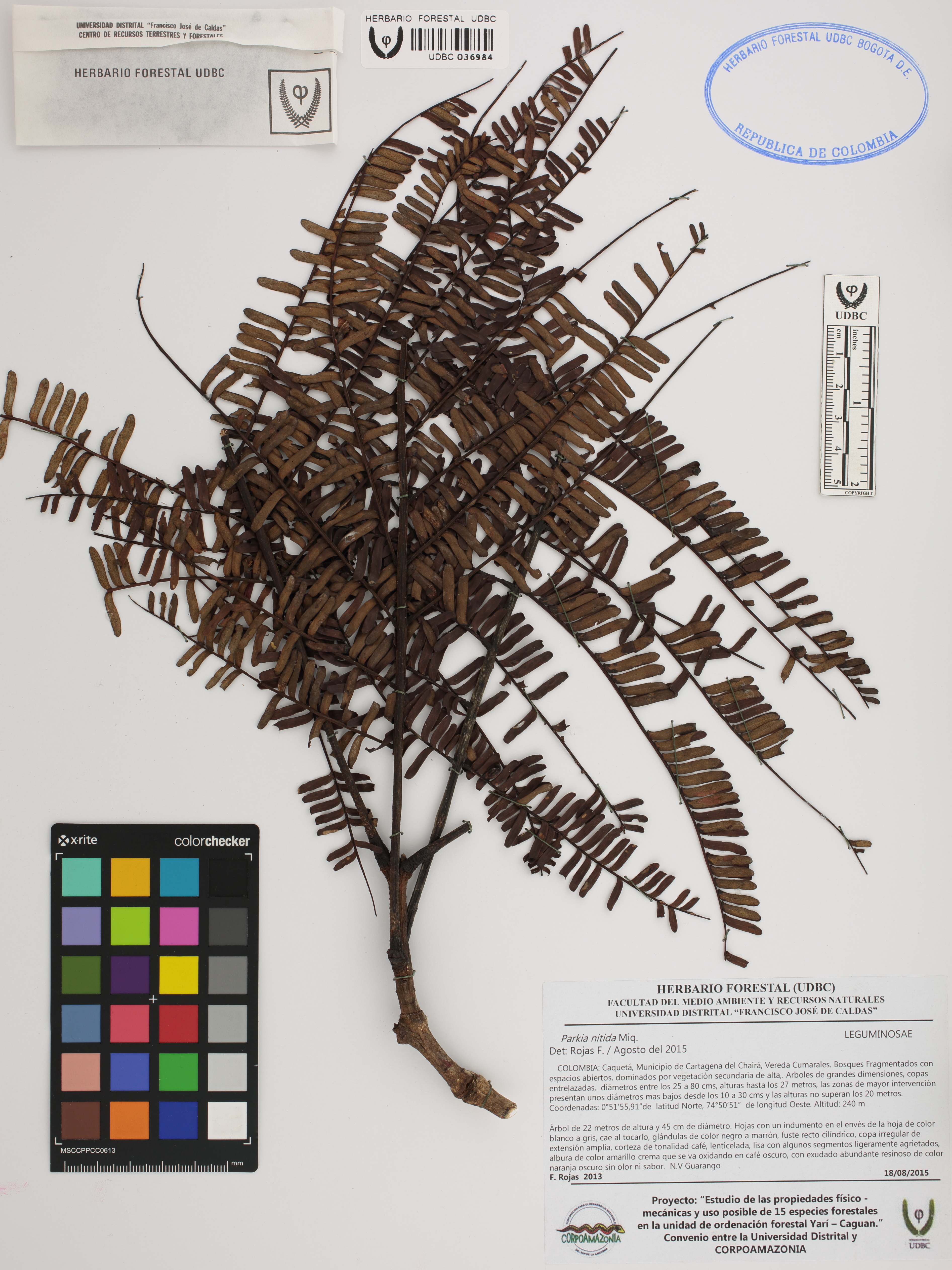 Fotografía del ejemplar Rojas, F. 2013, determinado como Parkia nitida en el año 2015