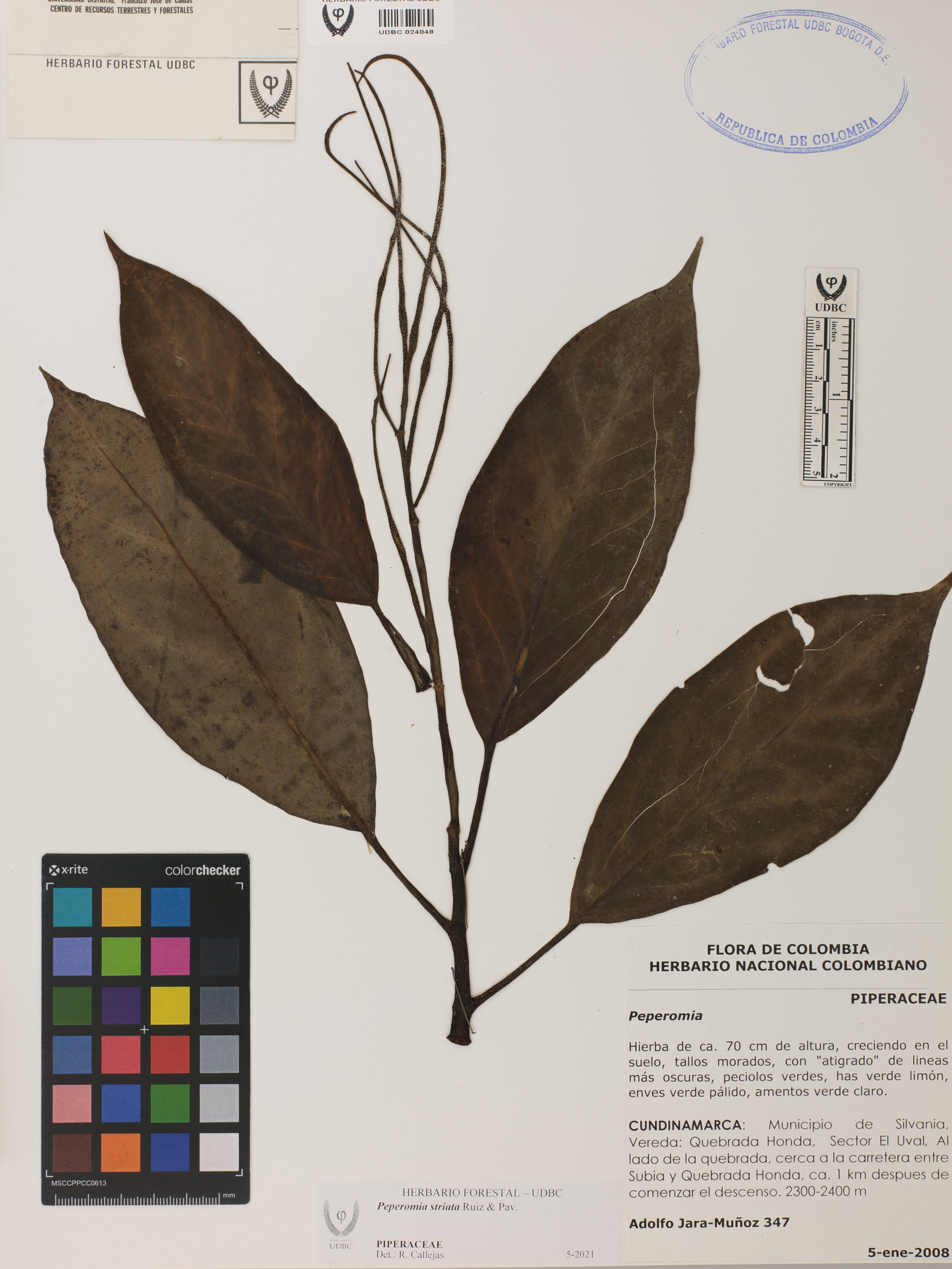 Fotografía del ejemplar Jara-Muñoz, A. 347, determinado como Peperomia striata en el año 2021
