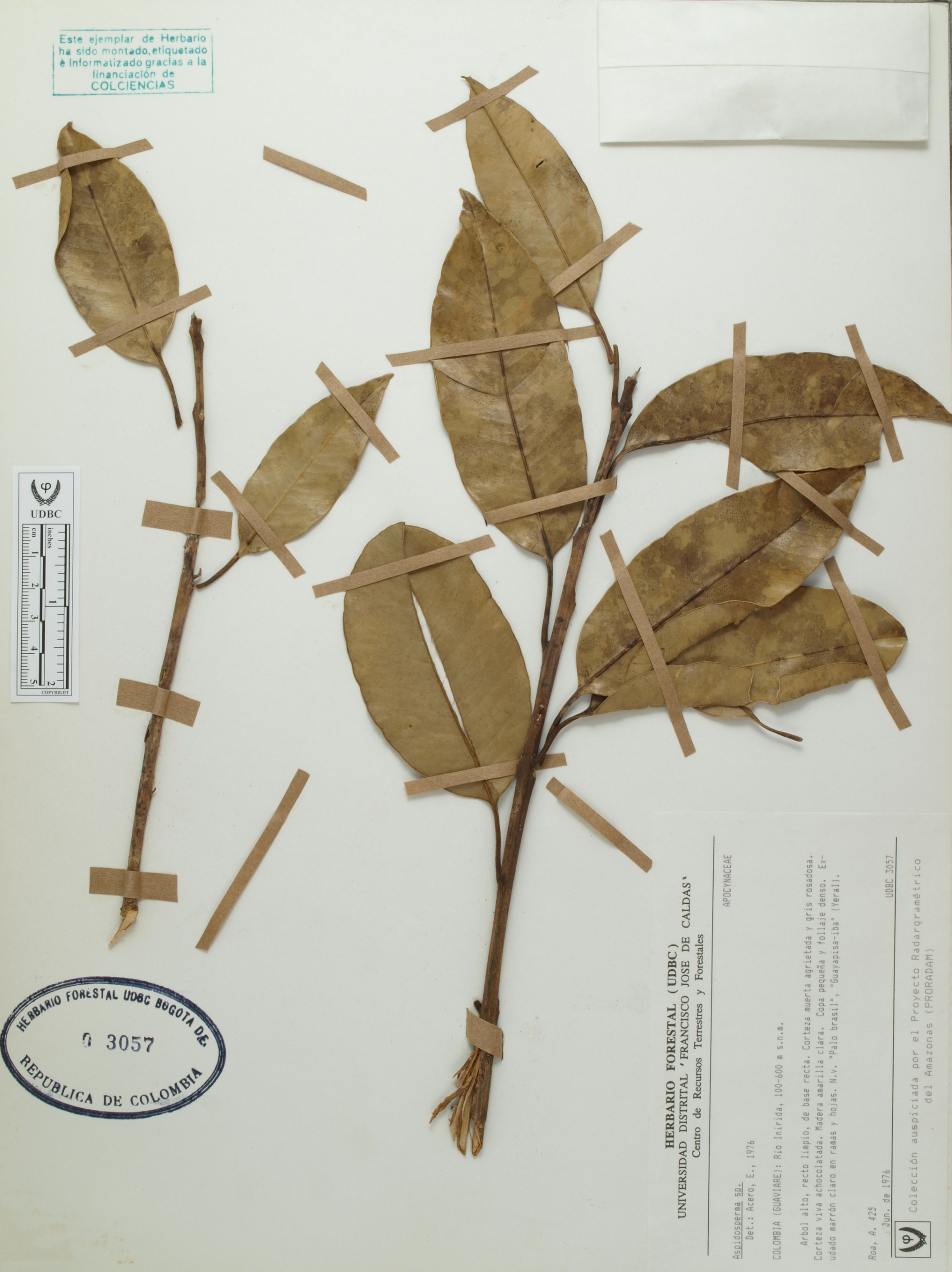 Fotografía del ejemplar Roa, A. 425, determinado como Aspidosperma sp. en el año 1976
