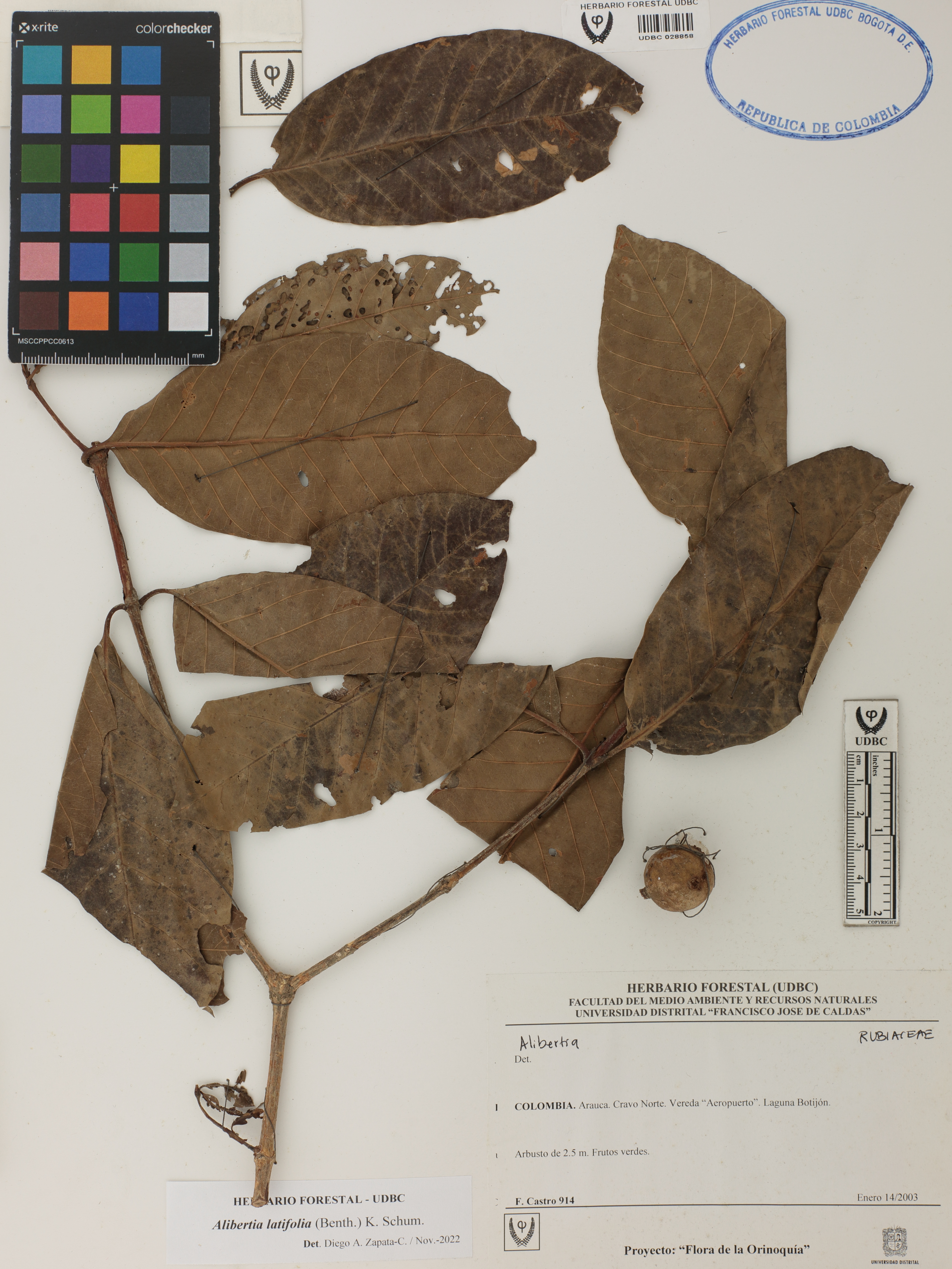Fotografía del ejemplar Castro, F. 914, determinado como Alibertia latifolia en el año 2022