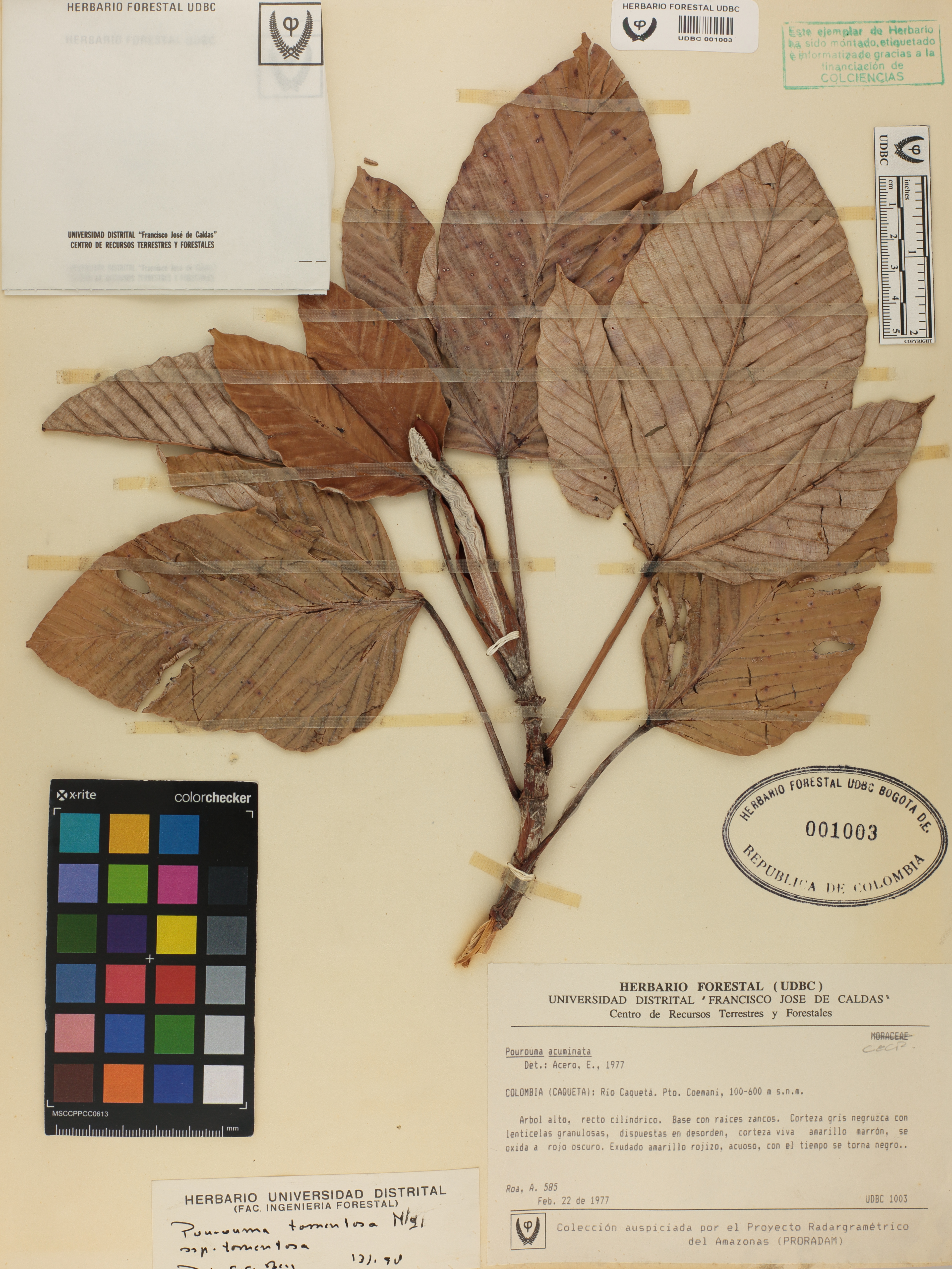 Fotografía del ejemplar Roa, A. 585, determinado como Pourouma tomentosa subsp. persecta en el año 1995