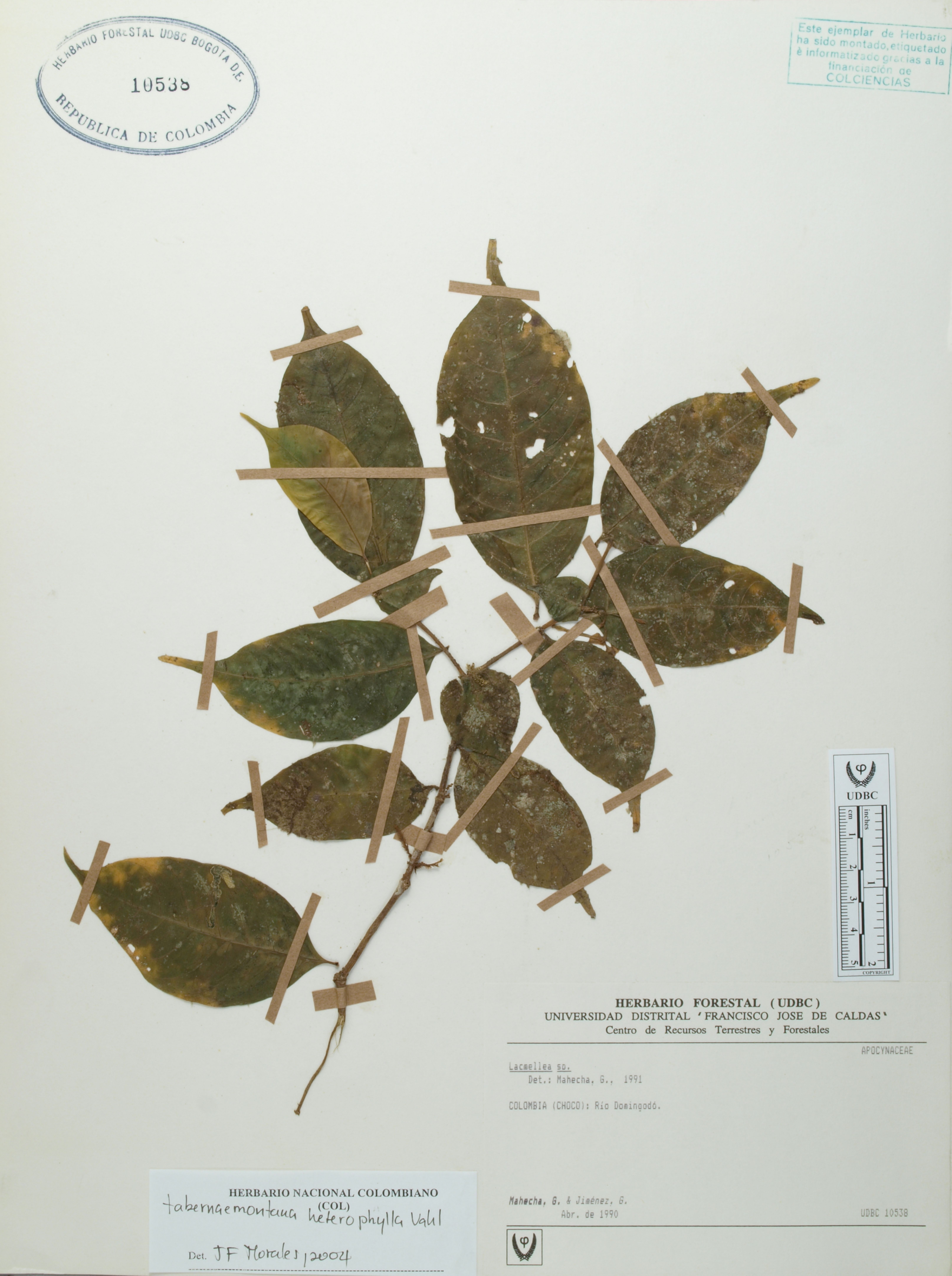 Fotografía del ejemplar Mahecha, G., determinado como Tabernaemontana heterophylla en el año 2004