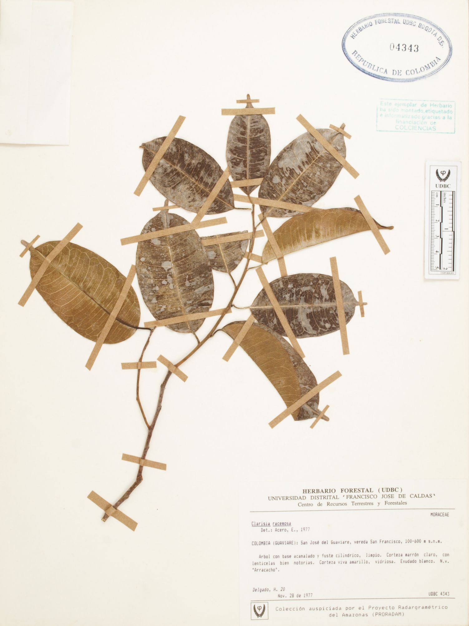 Fotografía del ejemplar Delgado, H. 20, determinado como Clarisia racemosa en el año 1977