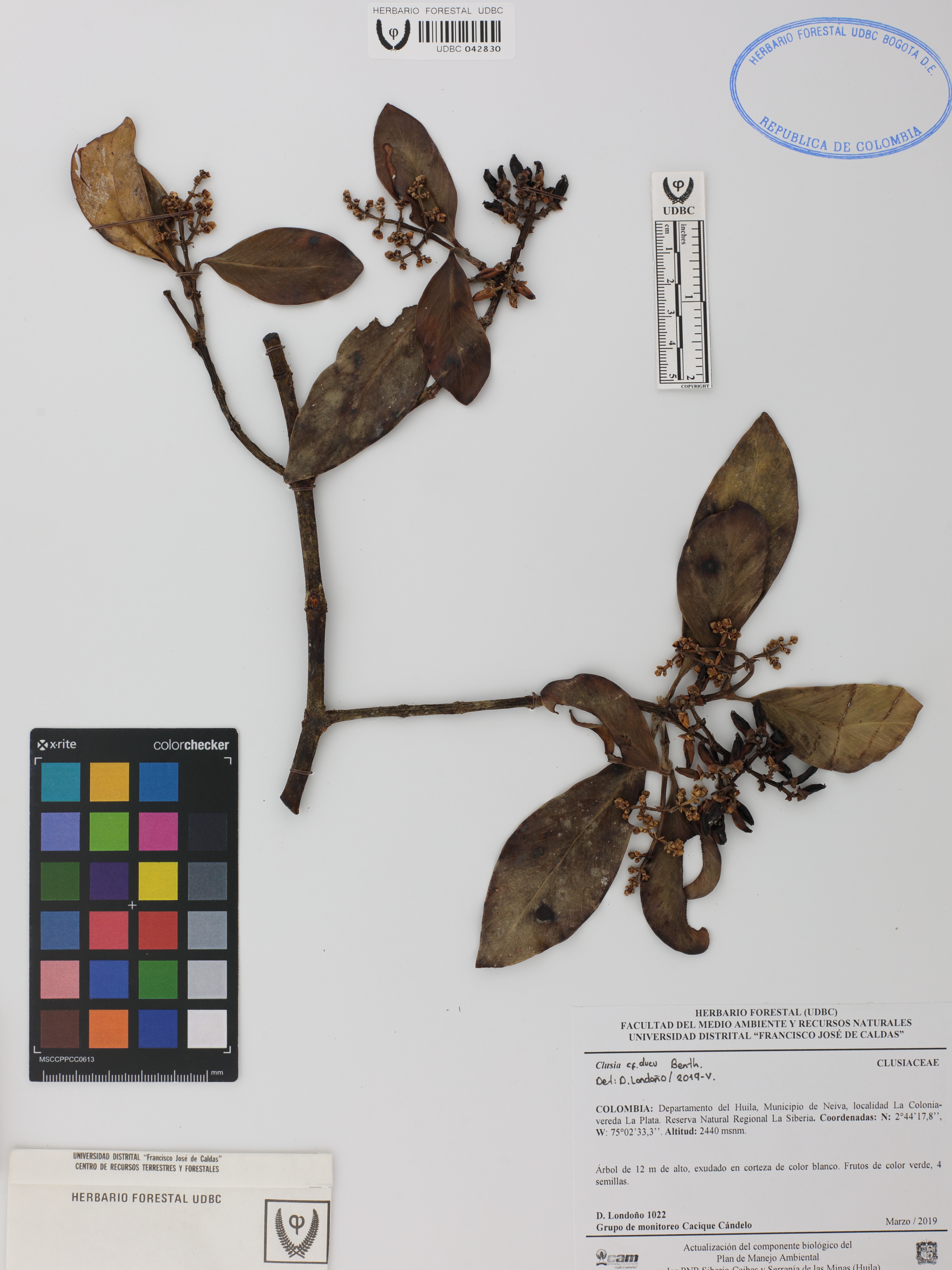 Fotografía del ejemplar Londoño, D. 1022, determinado como Clusia ducu en el año 2019