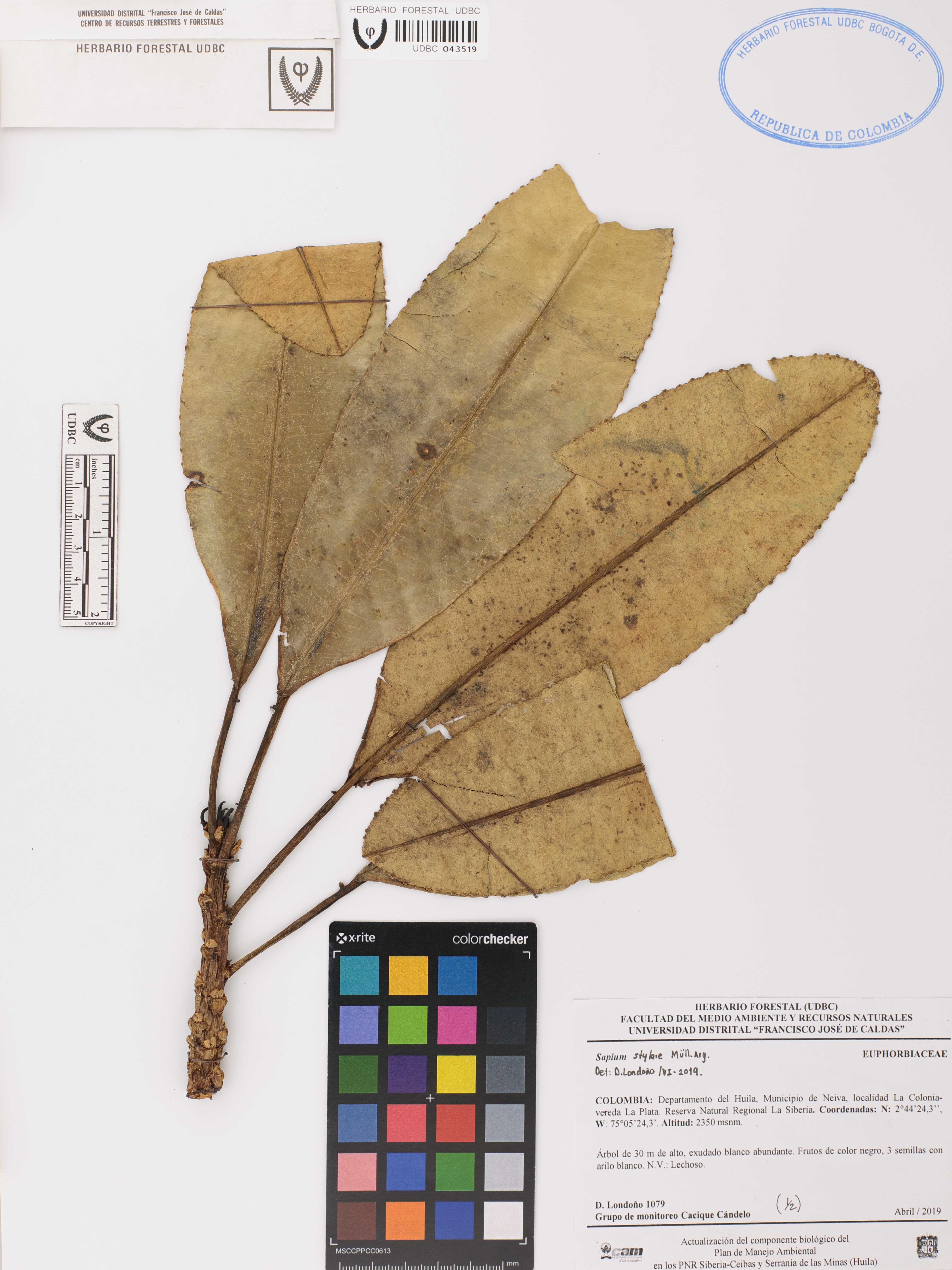 Fotografía del ejemplar Londoño, D. 1079, determinado como Sapium stylare en el año 2019