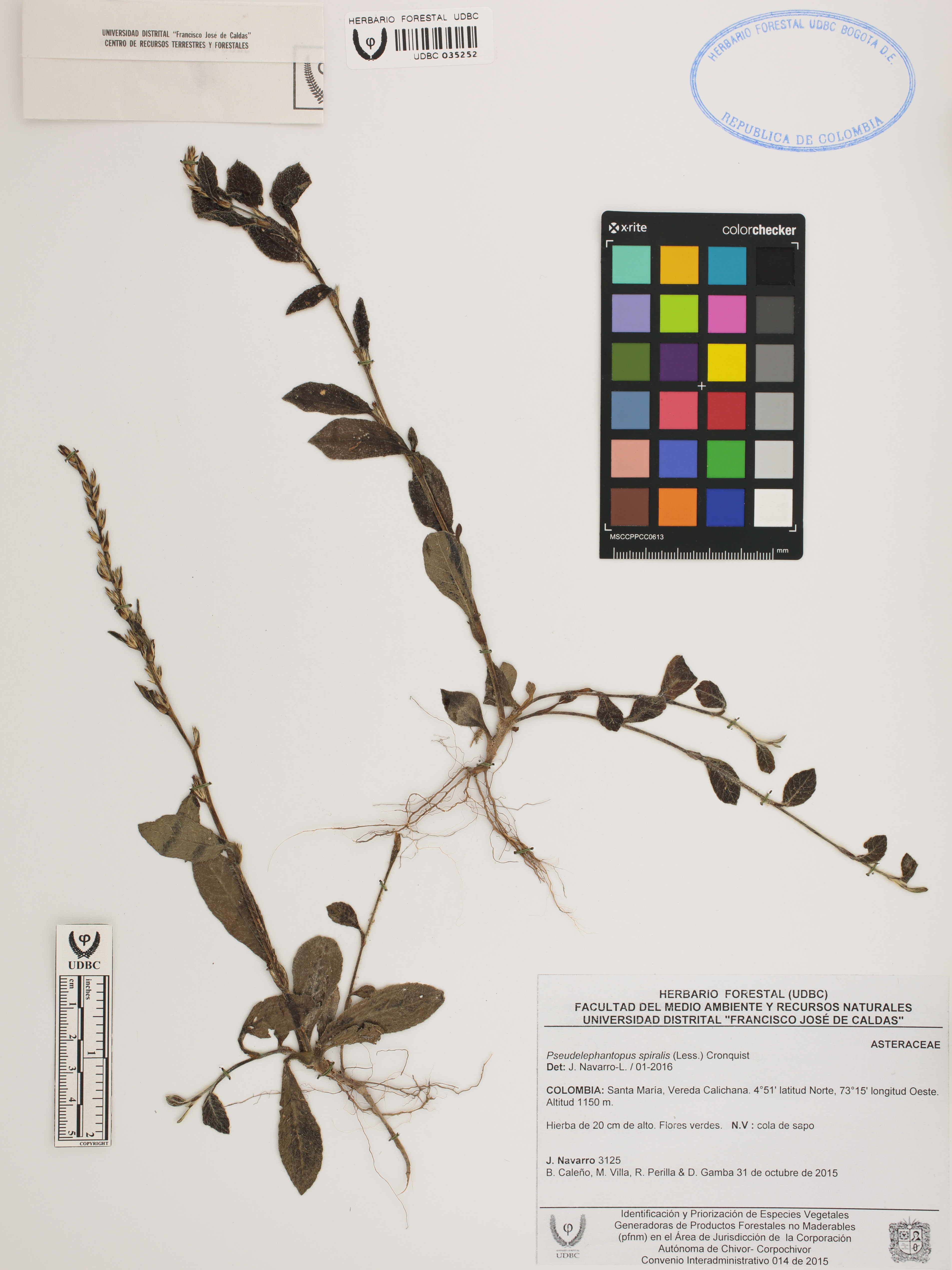 Fotografía del ejemplar Navarro, J. 3125, determinado como Pseudelephantopus spiralis en el año 2016