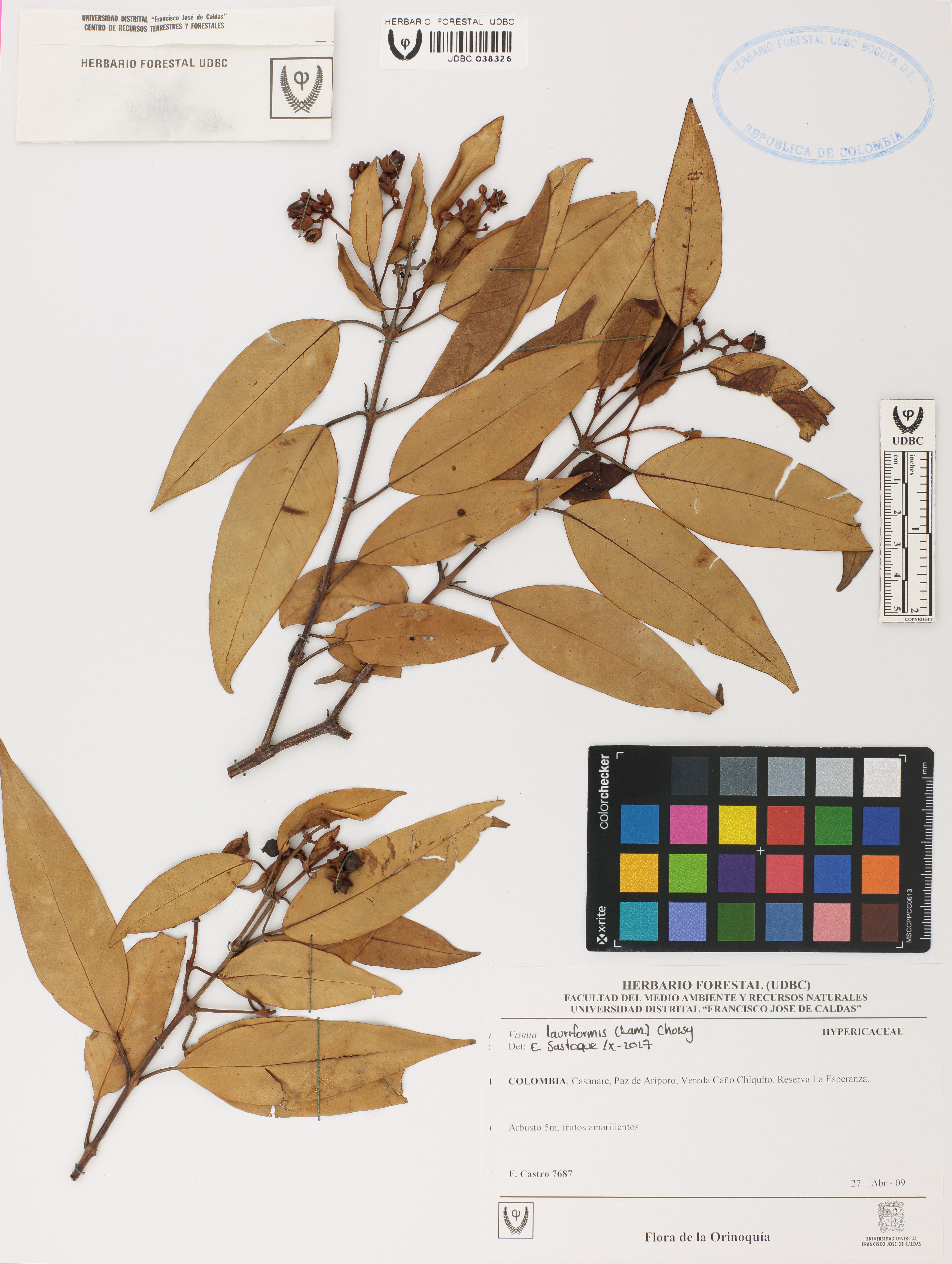 Fotografía del ejemplar Castro, F. 7687, determinado como Vismia lauriformis en el año 2017