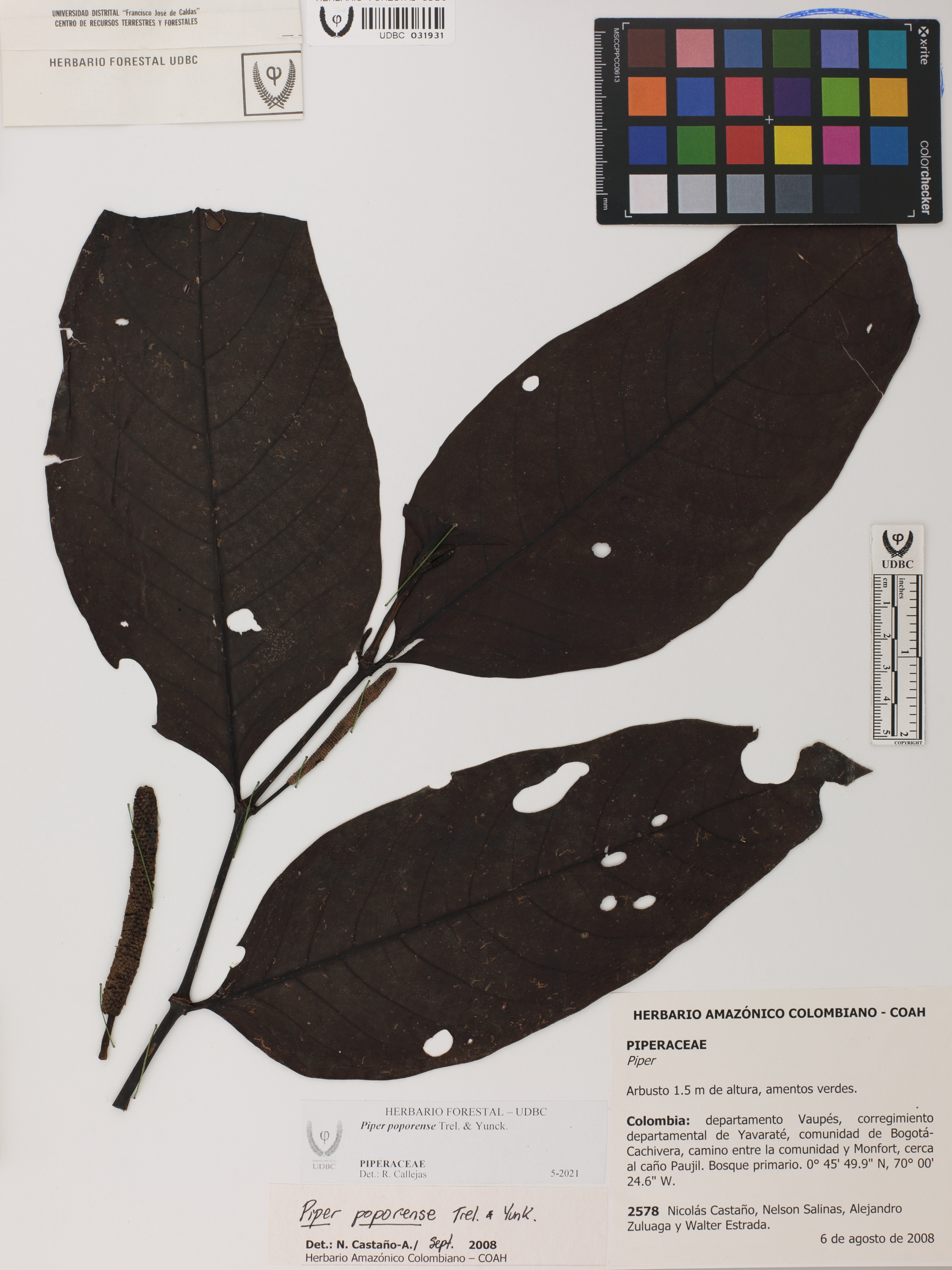 Fotografía del ejemplar Castaño, N. 2578, determinado como Piper poporense en el año 2021