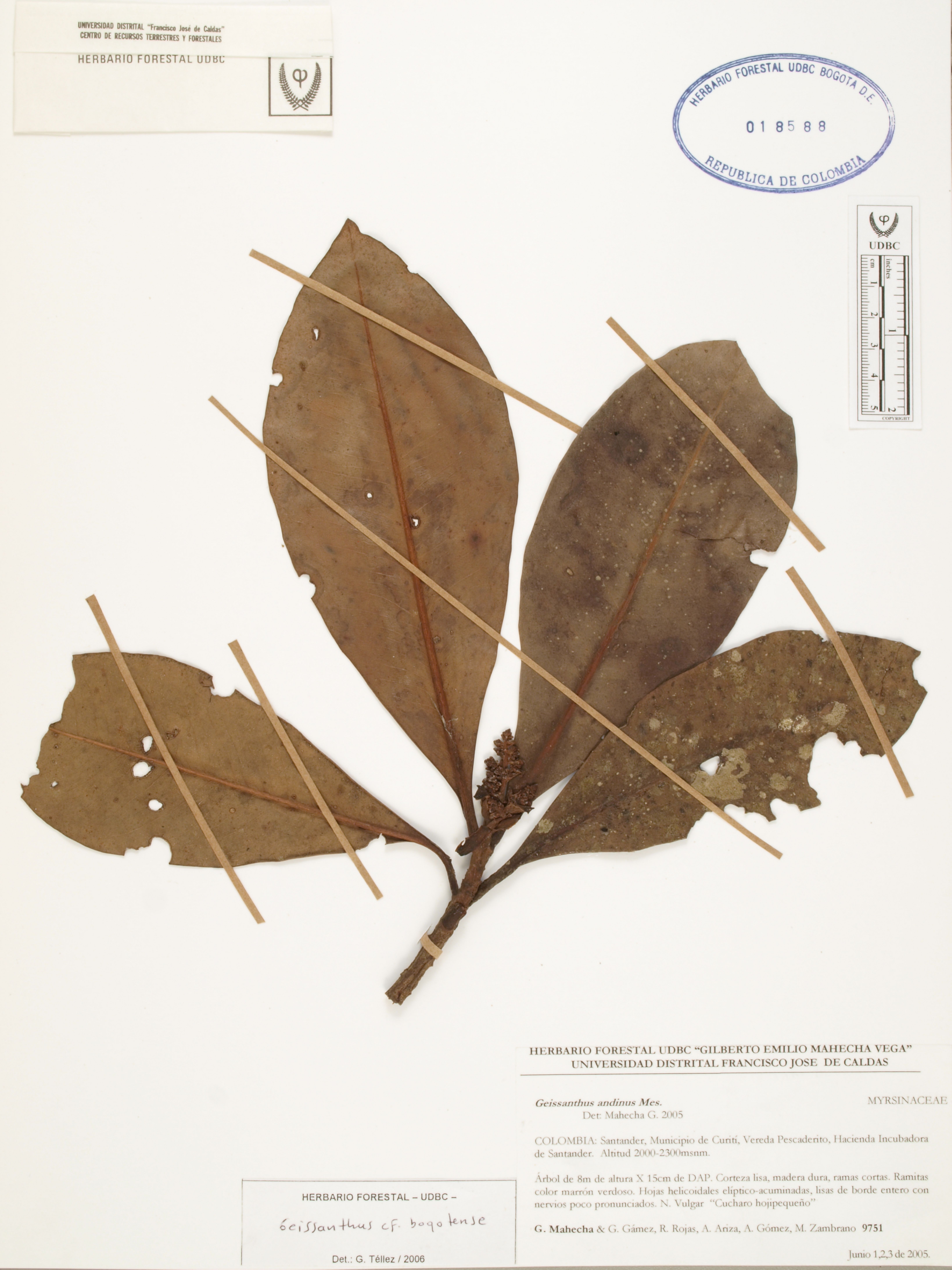 Fotografía del ejemplar Mahecha, G. 9751, determinado como Geissanthus bogotensis en el año 2006