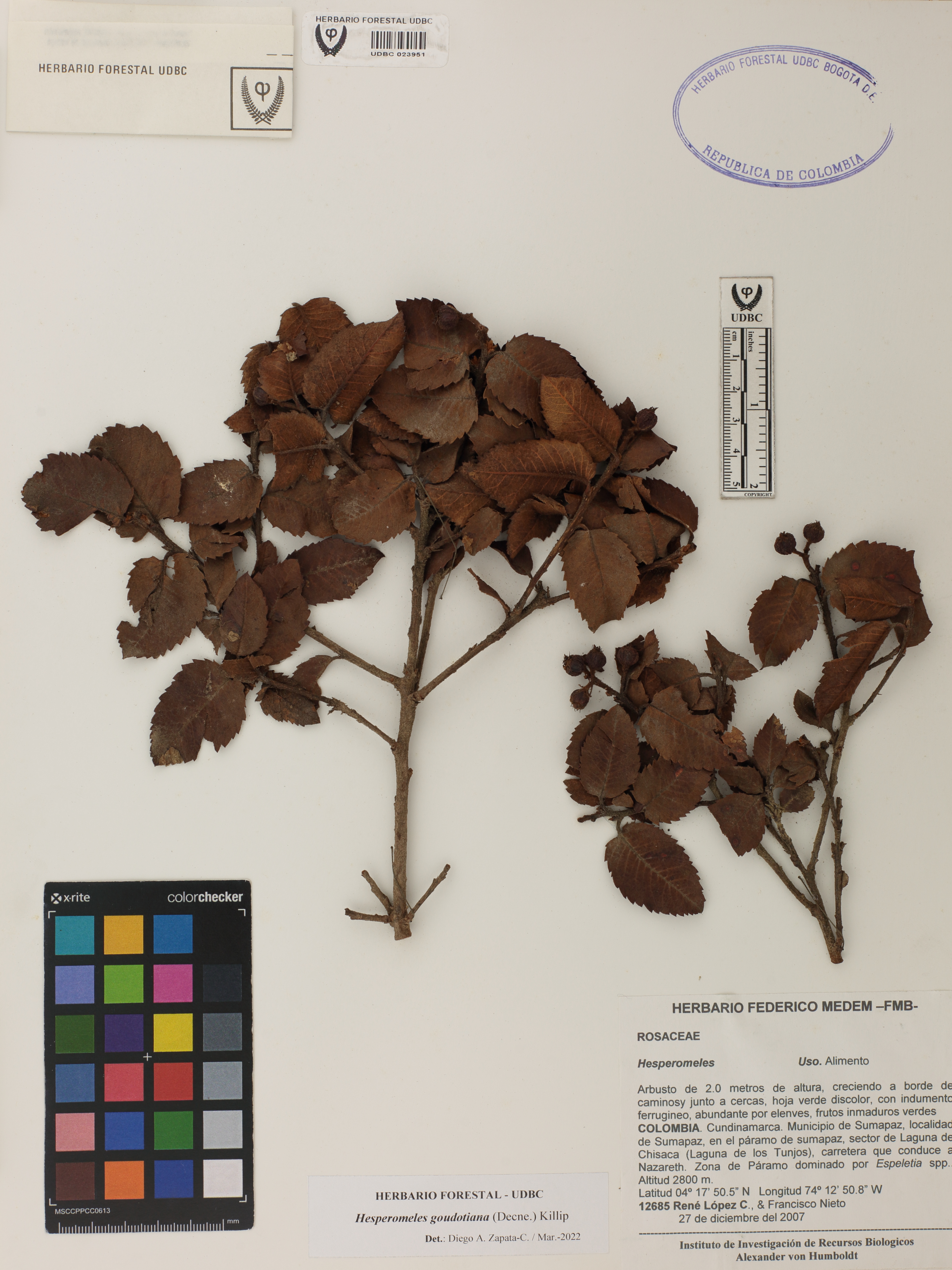 Fotografía del ejemplar López, R. 12685, determinado como Hesperomeles goudotiana en el año 2022