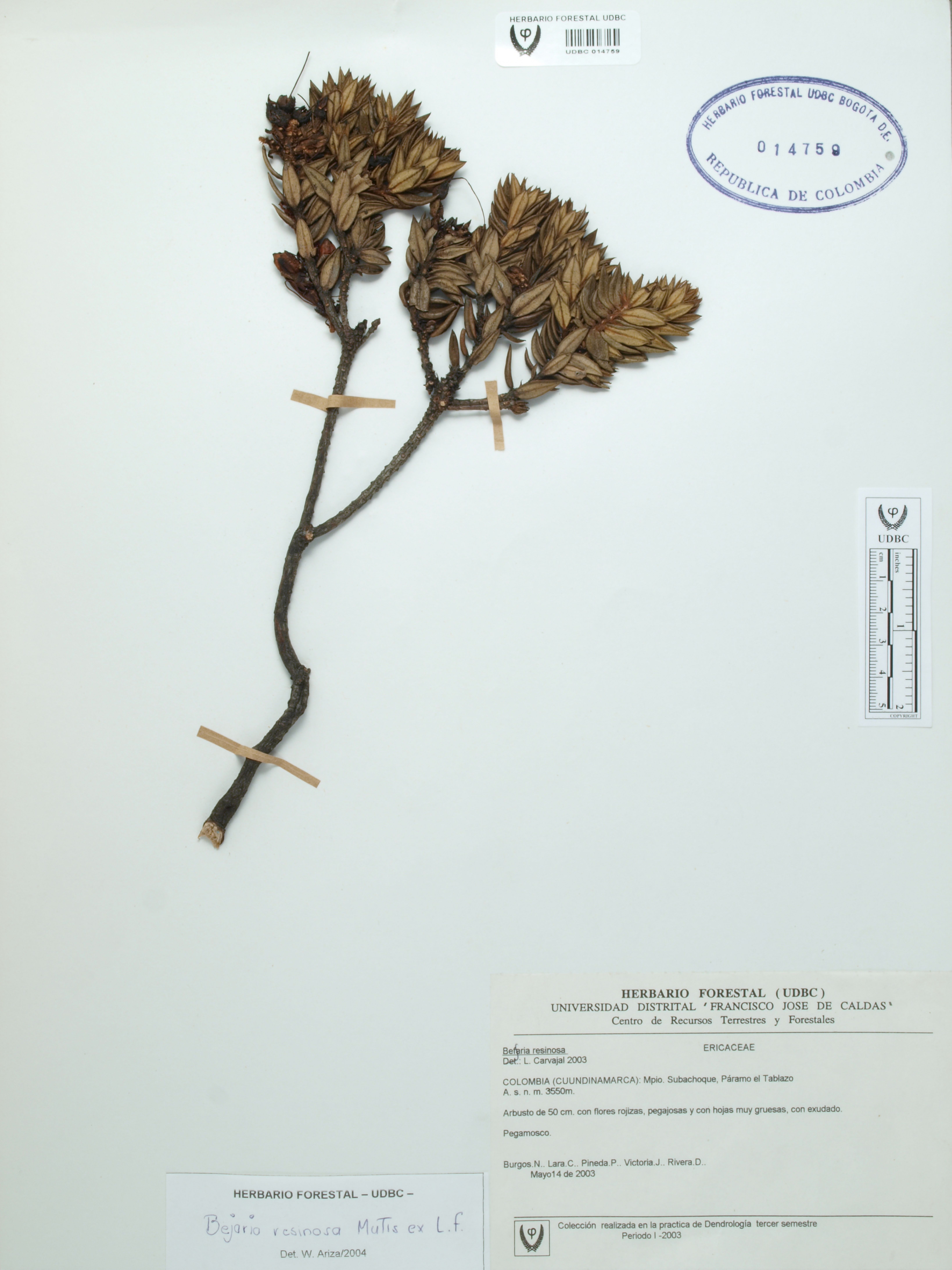 Fotografía del ejemplar Burgos, N., determinado como Bejaria resinosa en el año 2003