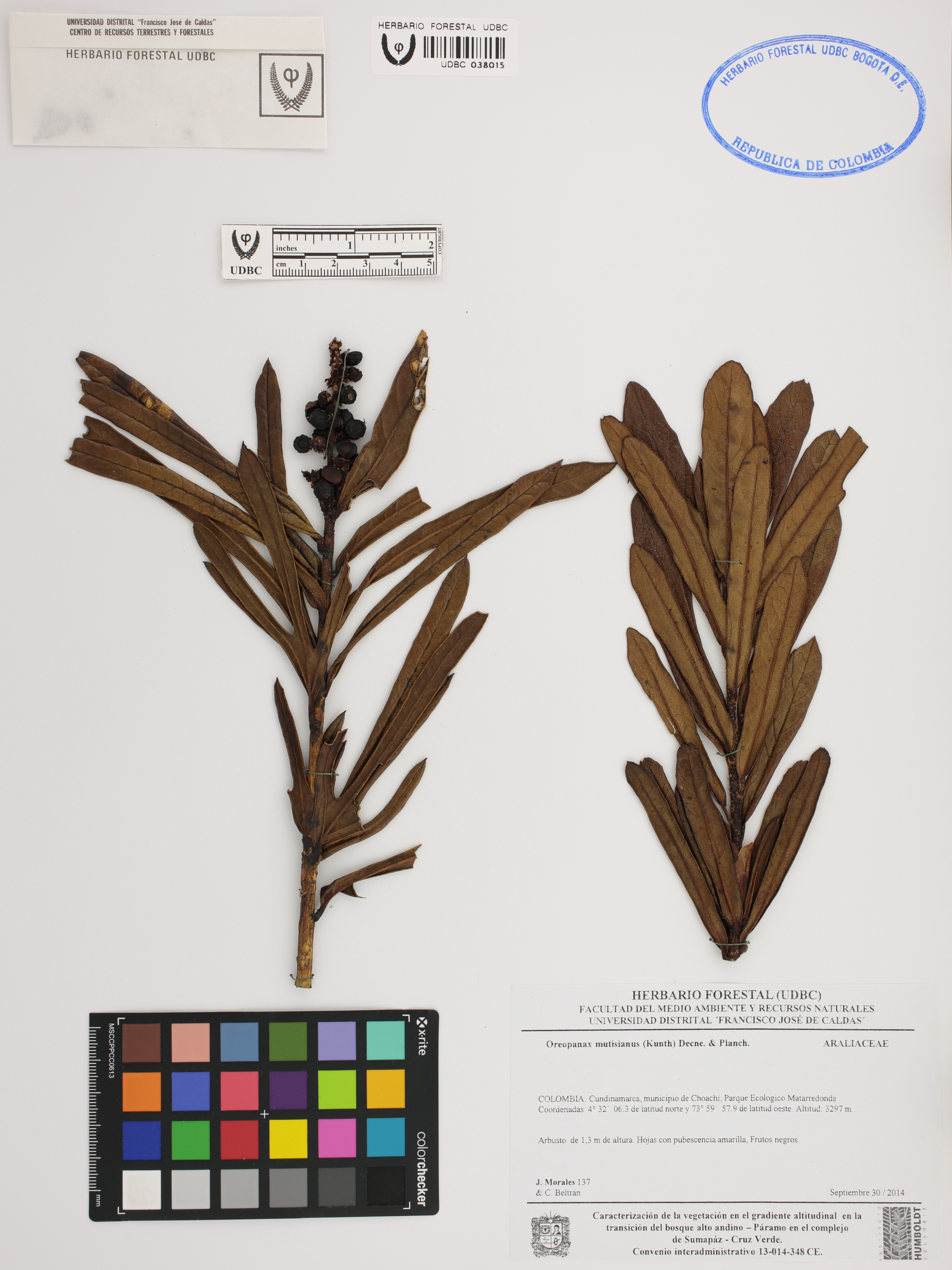 | dc.description | Fotografía del ejemplar Morales, J., determinado como Oreopanax mutisianus | |