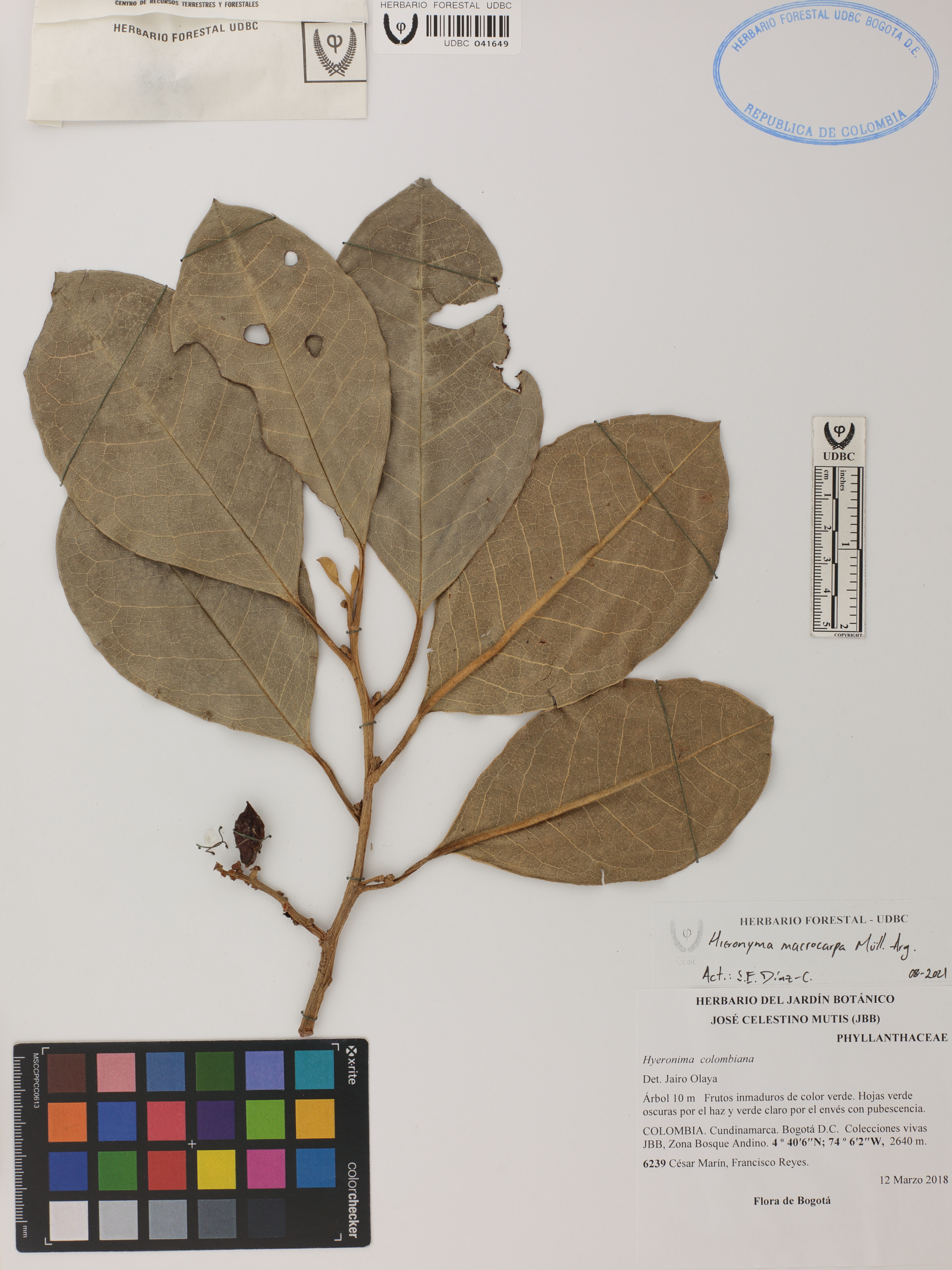 Fotografía del ejemplar Marín, C. 6239, determinado como Hieronyma macrocarpa en el año 2018