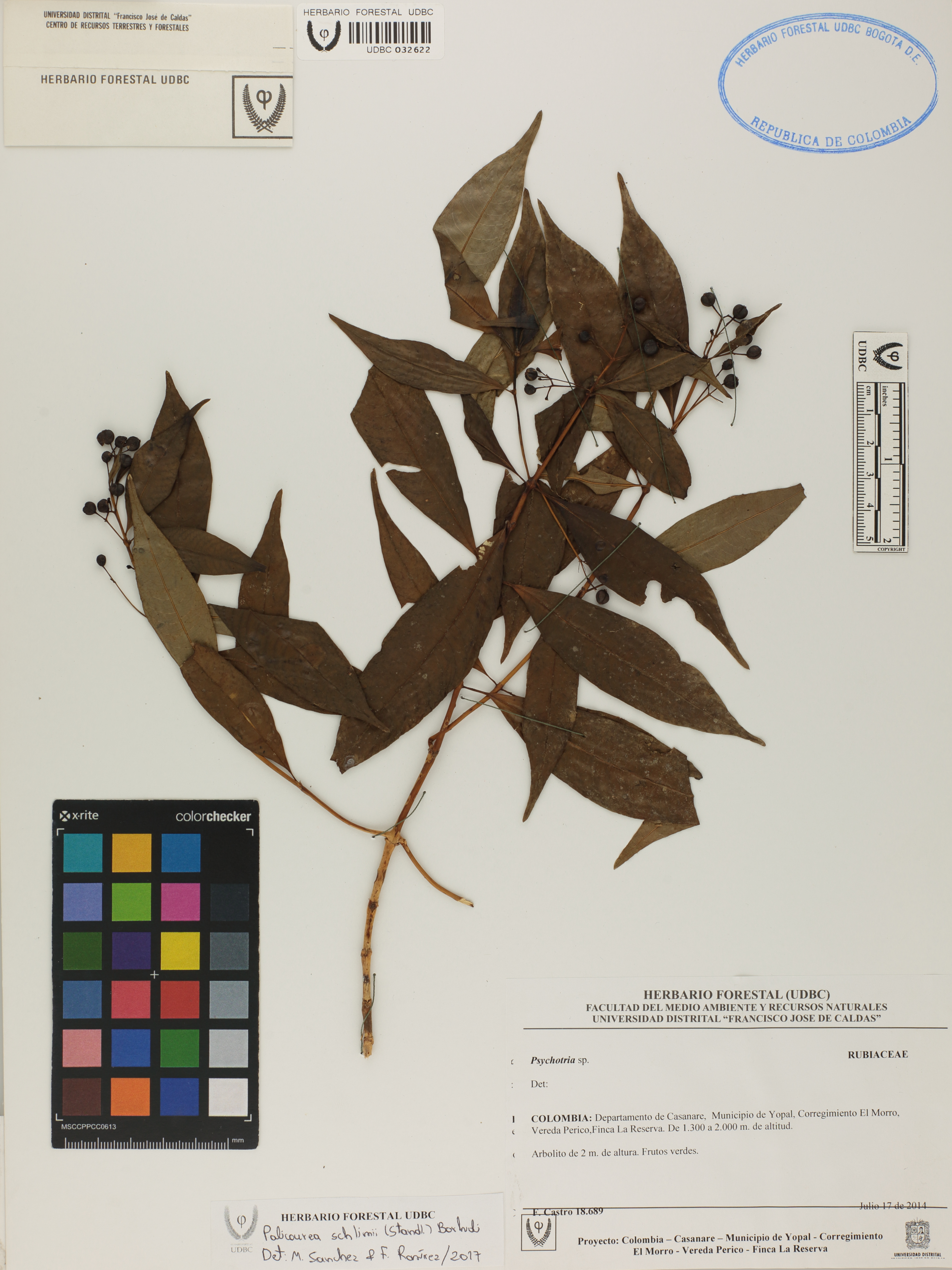 Fotografía del ejemplar Castro, F. 18689, determinado como Palicourea schlimii en el año 2017