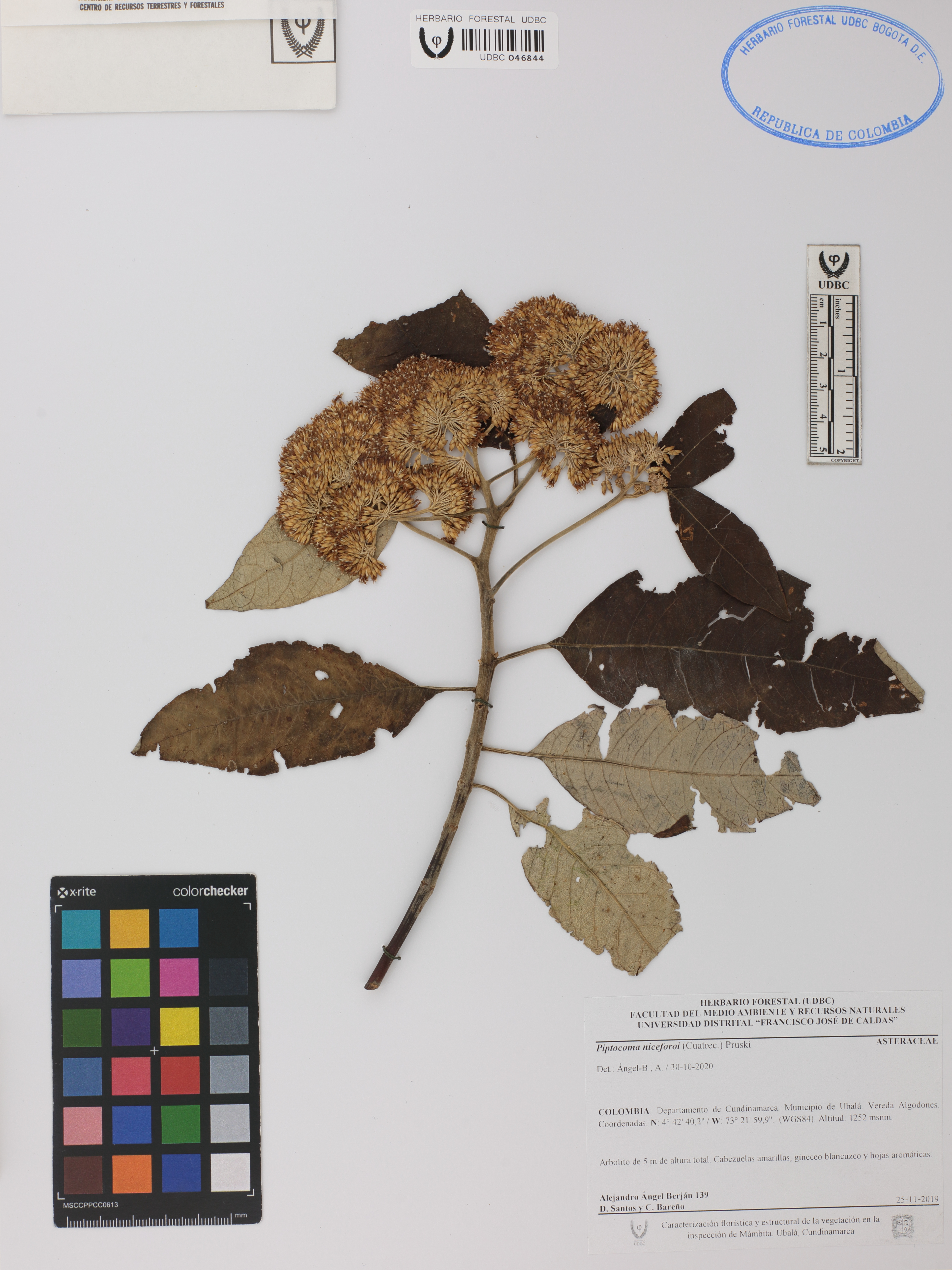 Fotografía del ejemplar Ángel-B., A. 139, determinado como Piptocoma niceforoi en el año 2020