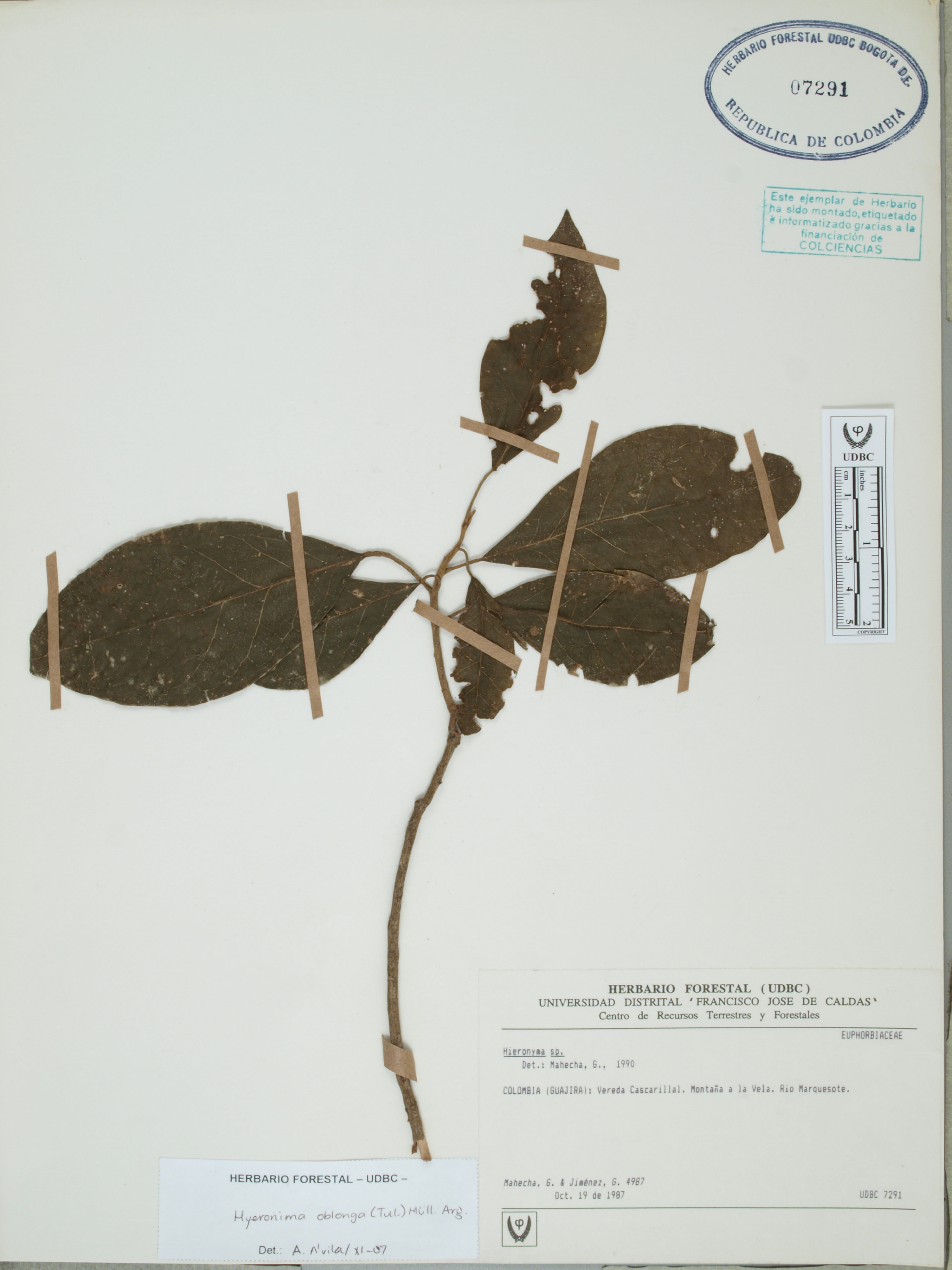 Fotografía del ejemplar Mahecha, G. 4987, determinado como Hieronyma oblonga en el año 2007
