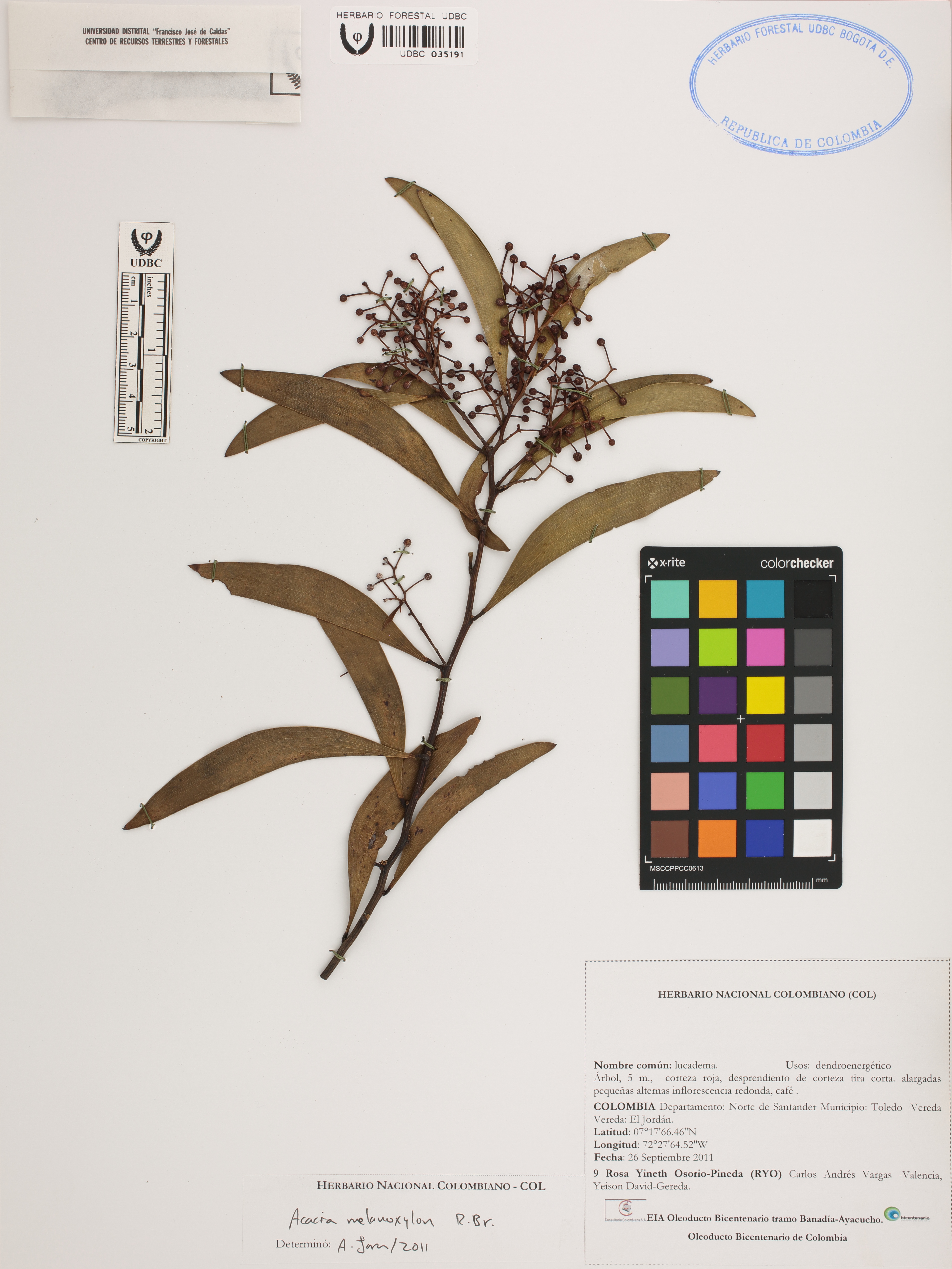 Fotografía del ejemplar Osorio-P., R. 9, determinado como Acacia melanoxylon en el año 2011