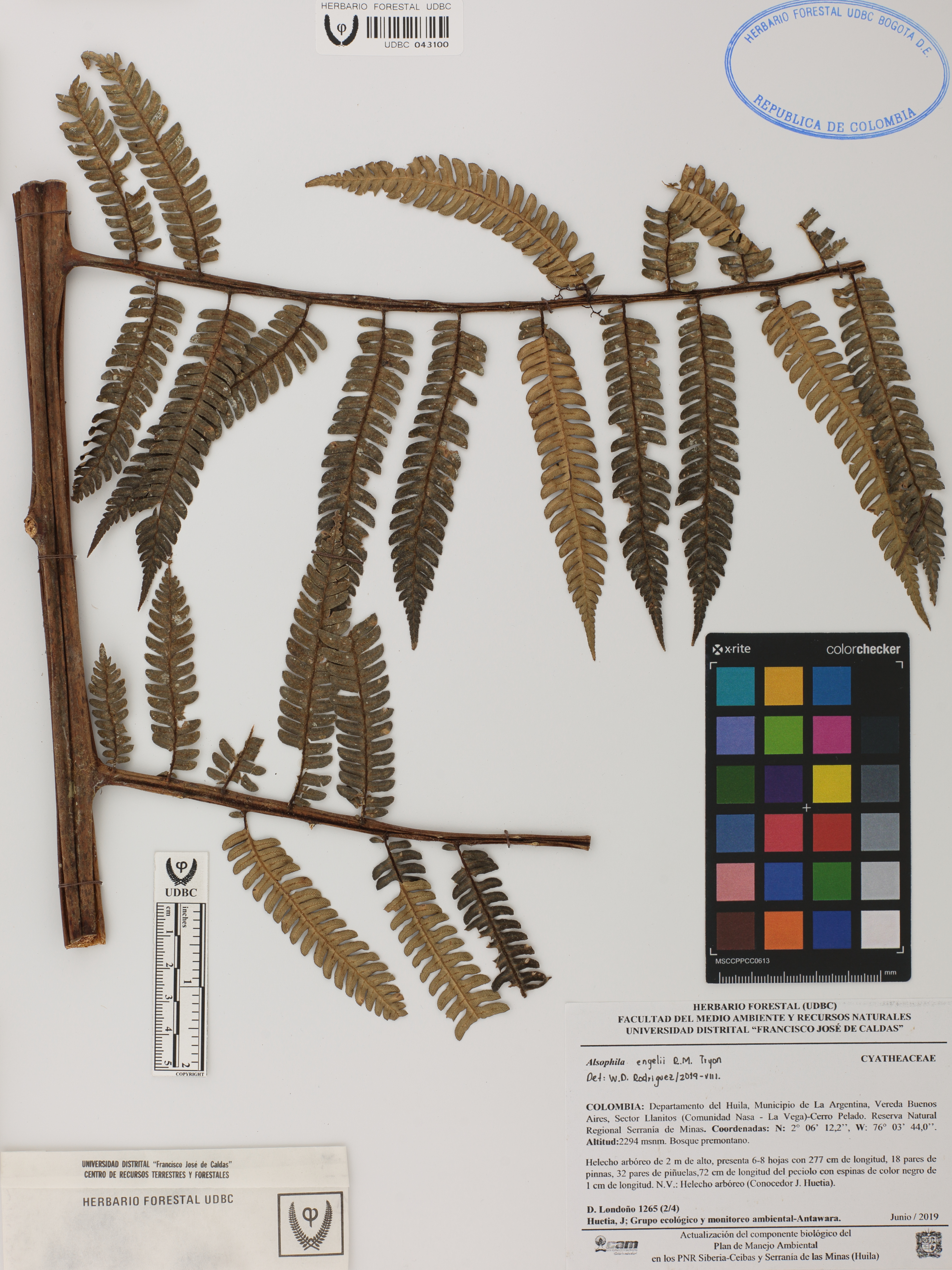 Fotografía del ejemplar Londoño, D. 1265, determinado como Alsophila engelii en el año 2019