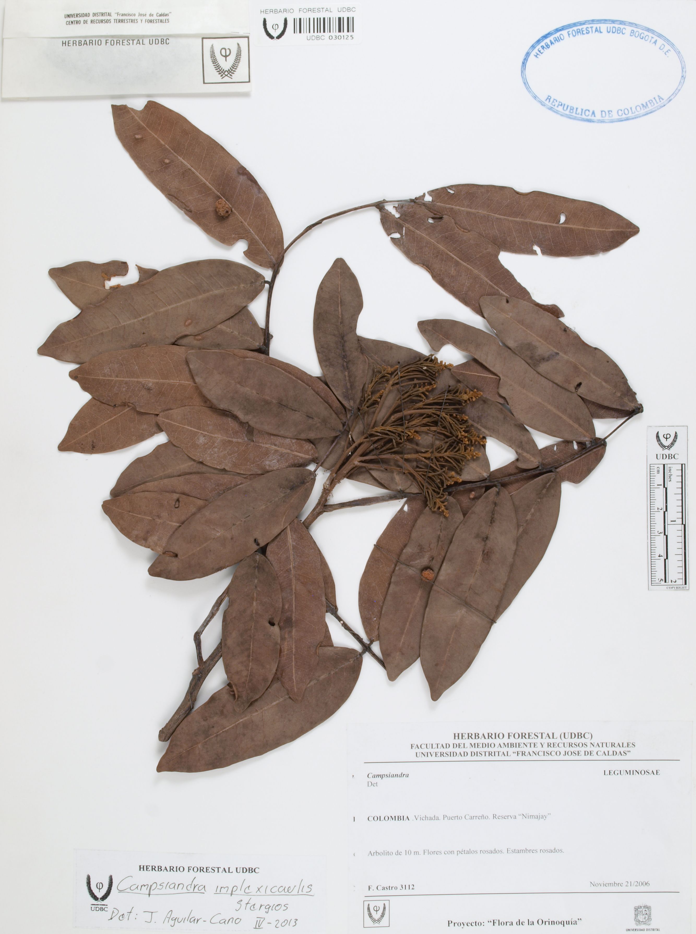 Fotografía del ejemplar Castro, F. 3112, determinado como Campsiandra implexicaulis en el año 2013