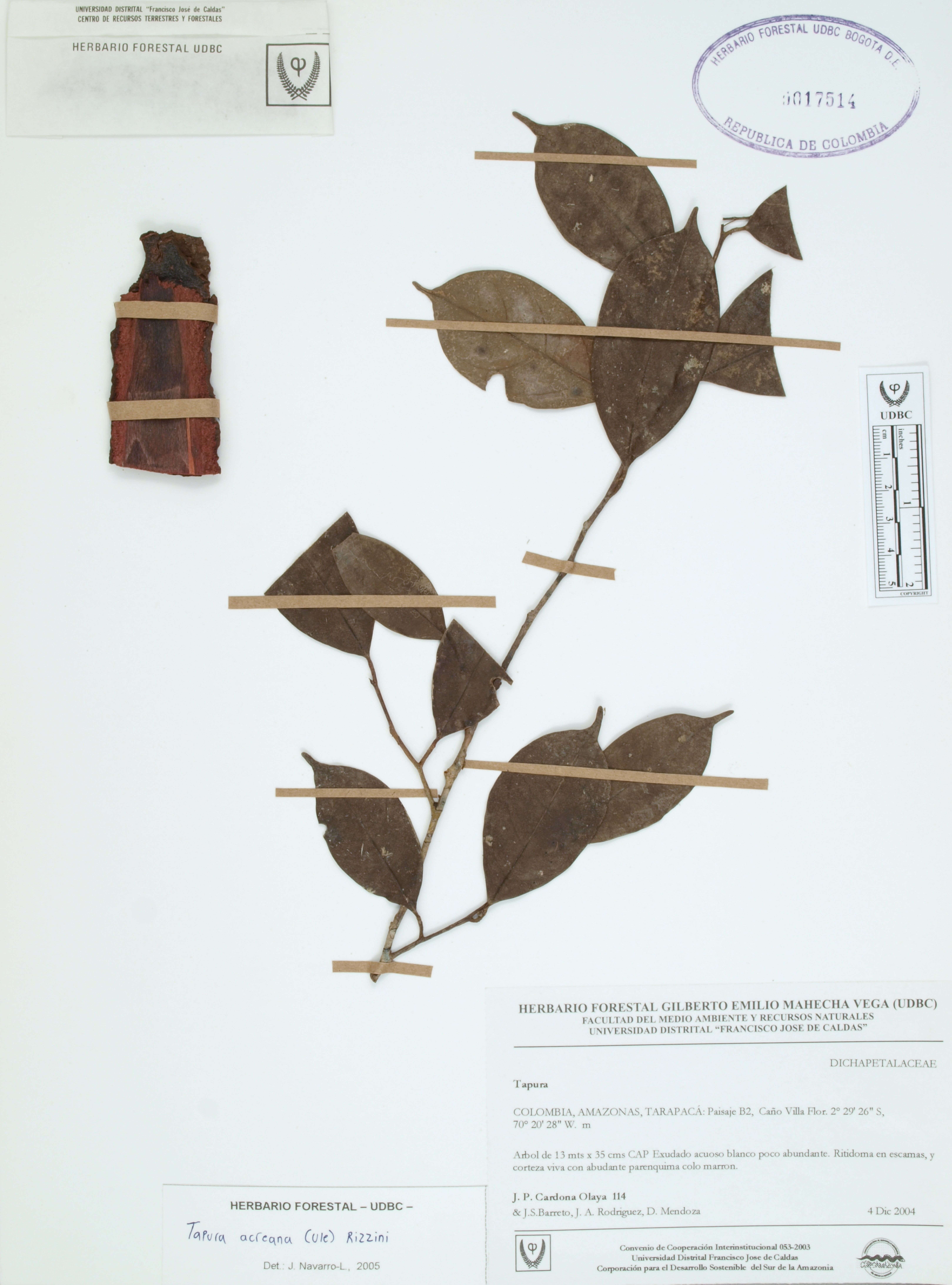 | dc.description | Fotografía del ejemplar Cardona, J. 114, determinado como Tapura acreana en el año 2005 | |