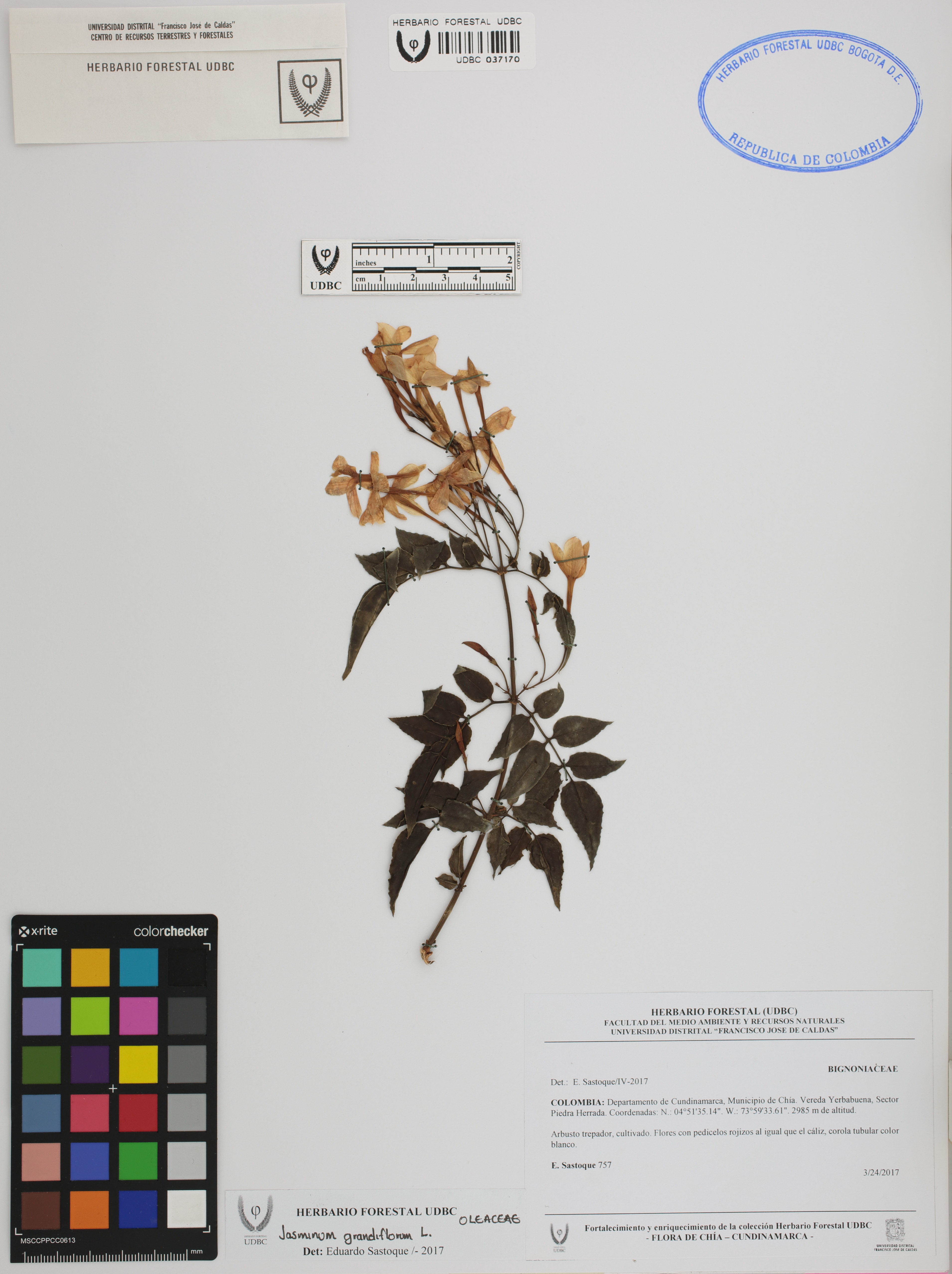 Fotografía del ejemplar Sastoque, E. 757, determinado como Jasminum grandiflorum en el año 2017