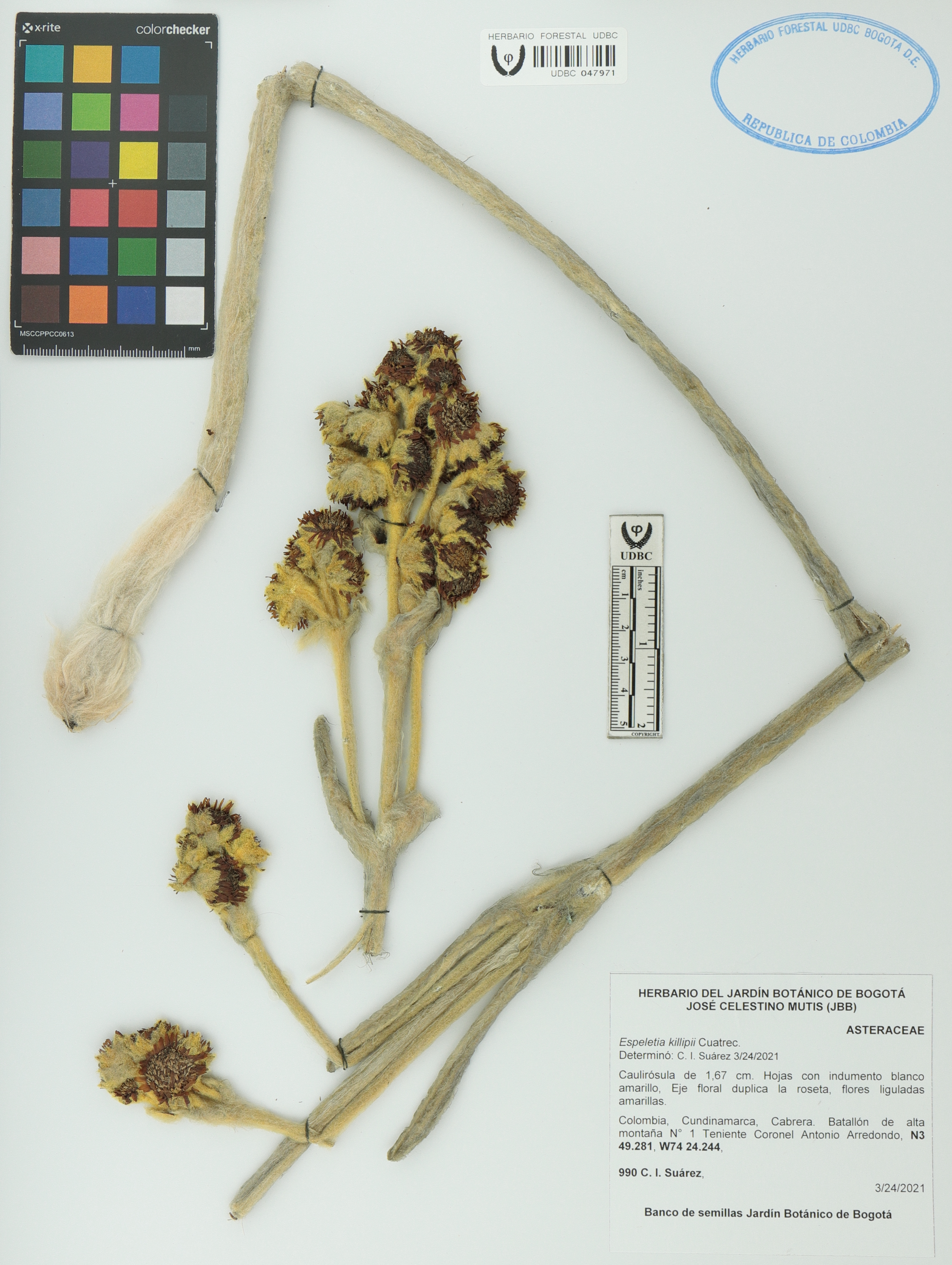 Fotografía del ejemplar Suárez, C. 990, determinado como Espeletia killipii en el año 2021