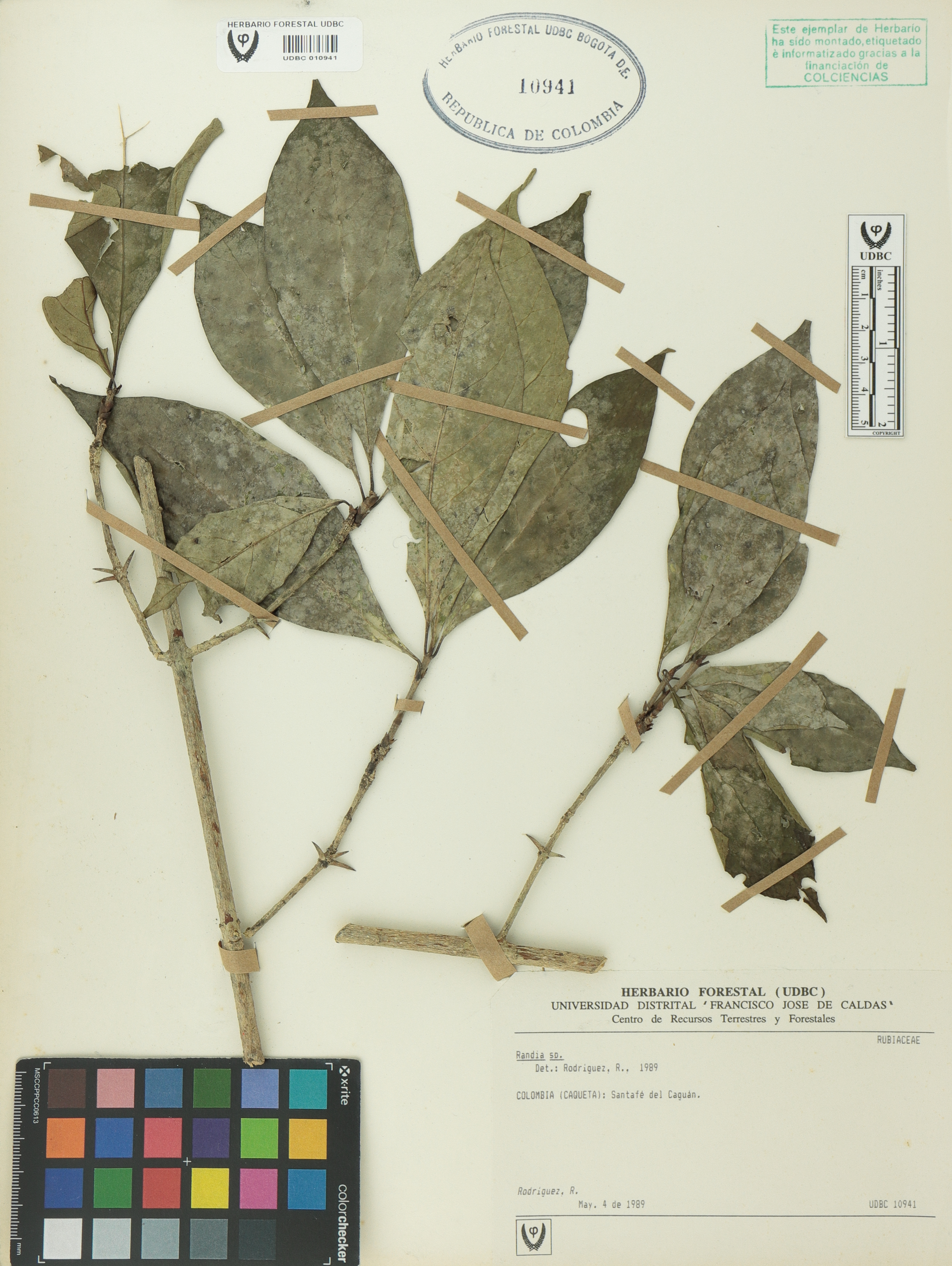 Fotografía del ejemplar Rodríguez, R., determinado como Randia sp. en el año 1989