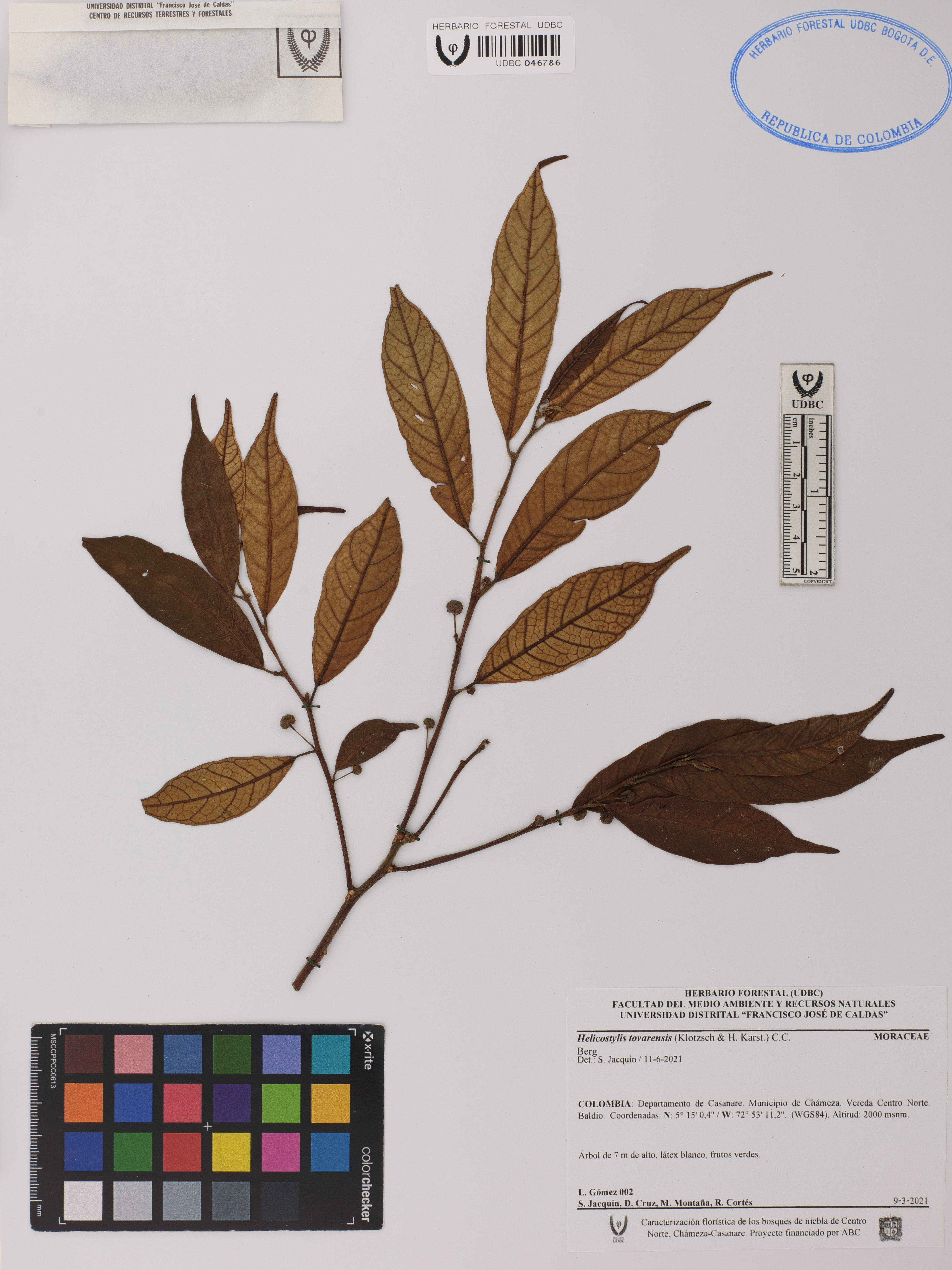 Fotografía del ejemplar Gómez, L. 2, determinado como Helicostylis tovarensis en el año 2021