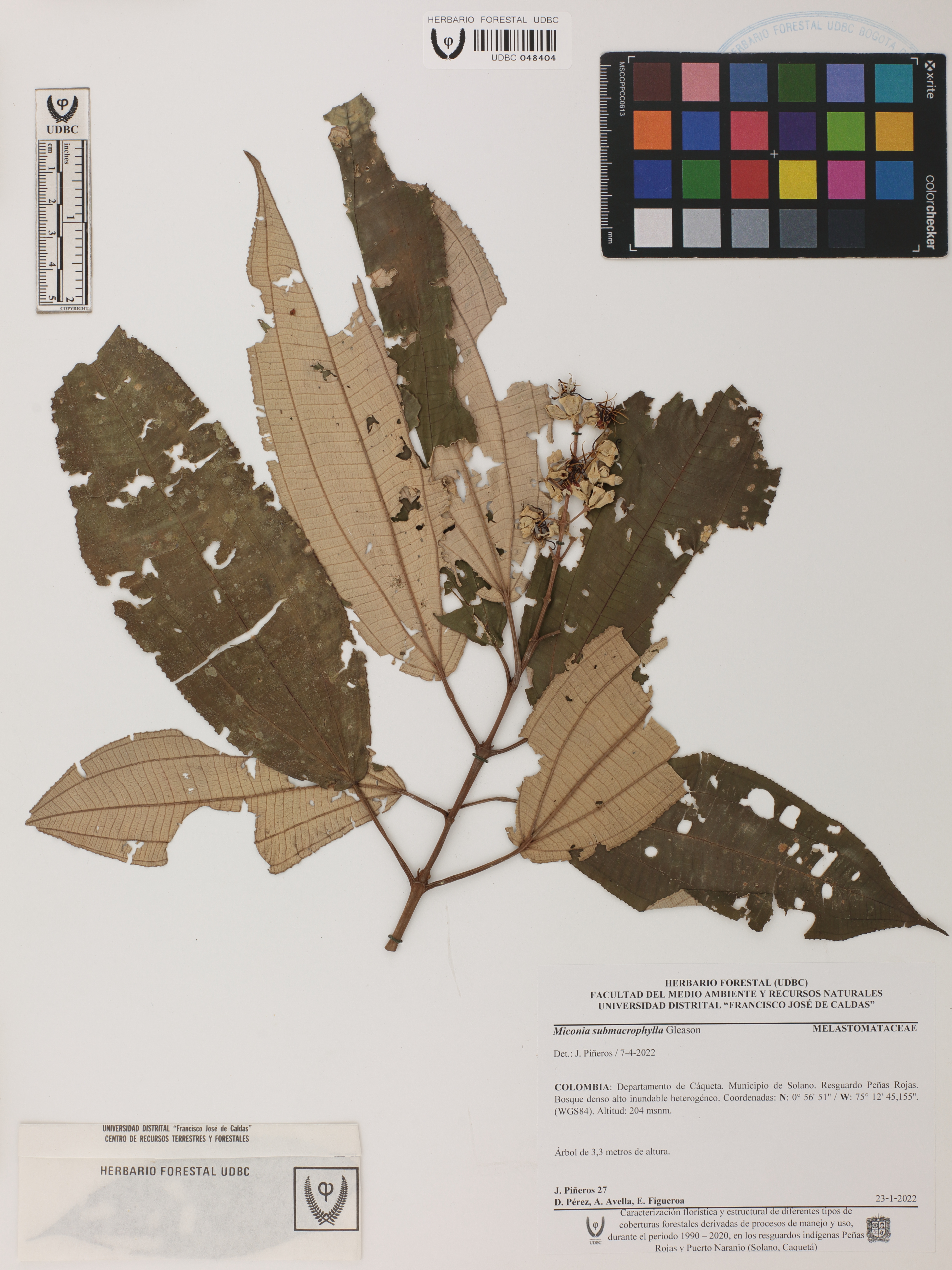 Fotografía del ejemplar Piñeros, J. 27, determinado como Miconia submacrophylla en el año 2022