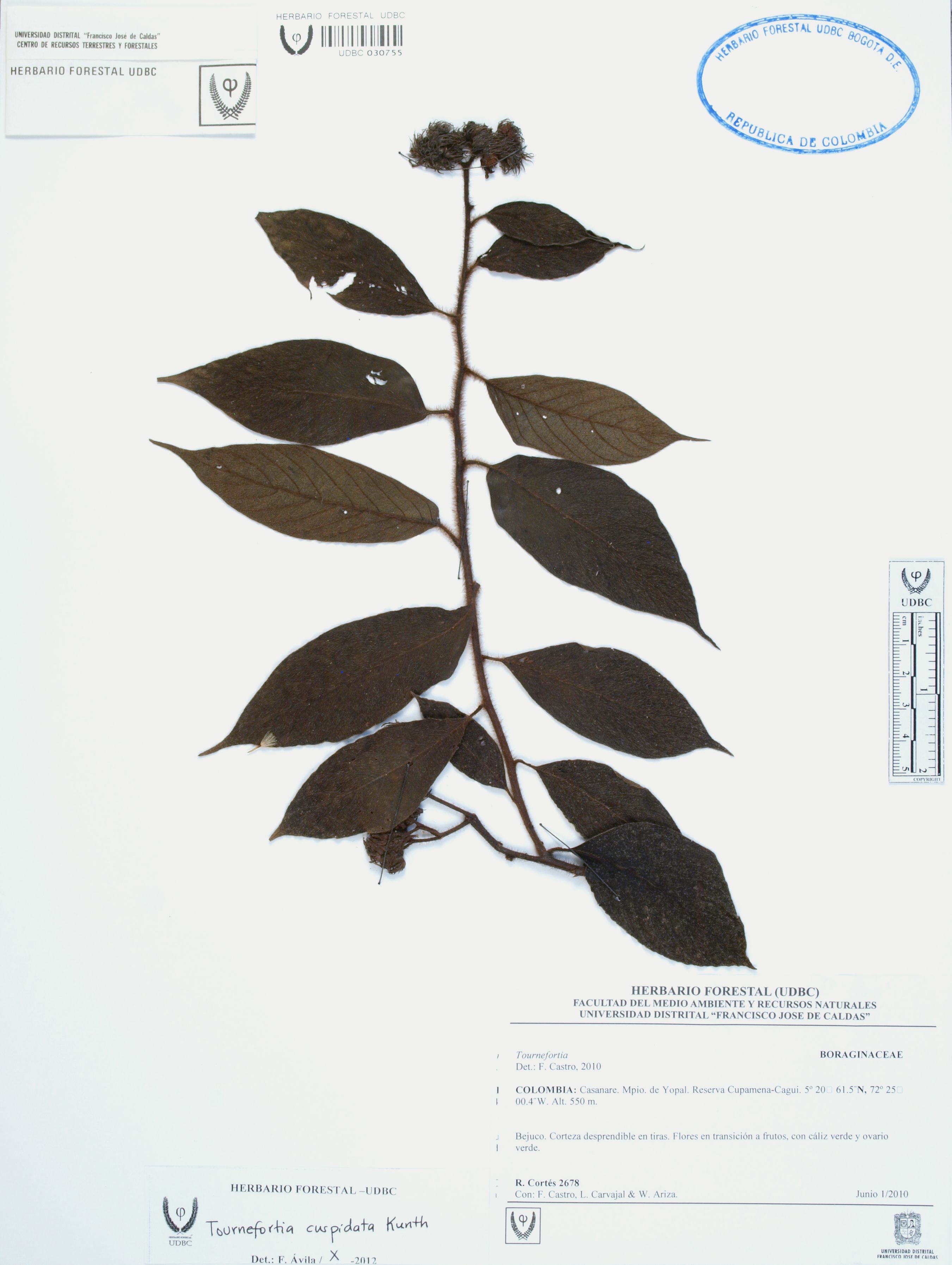 Fotografía del ejemplar Cortés-B., R. 2678, determinado como Tournefortia cuspidata en el año 2012