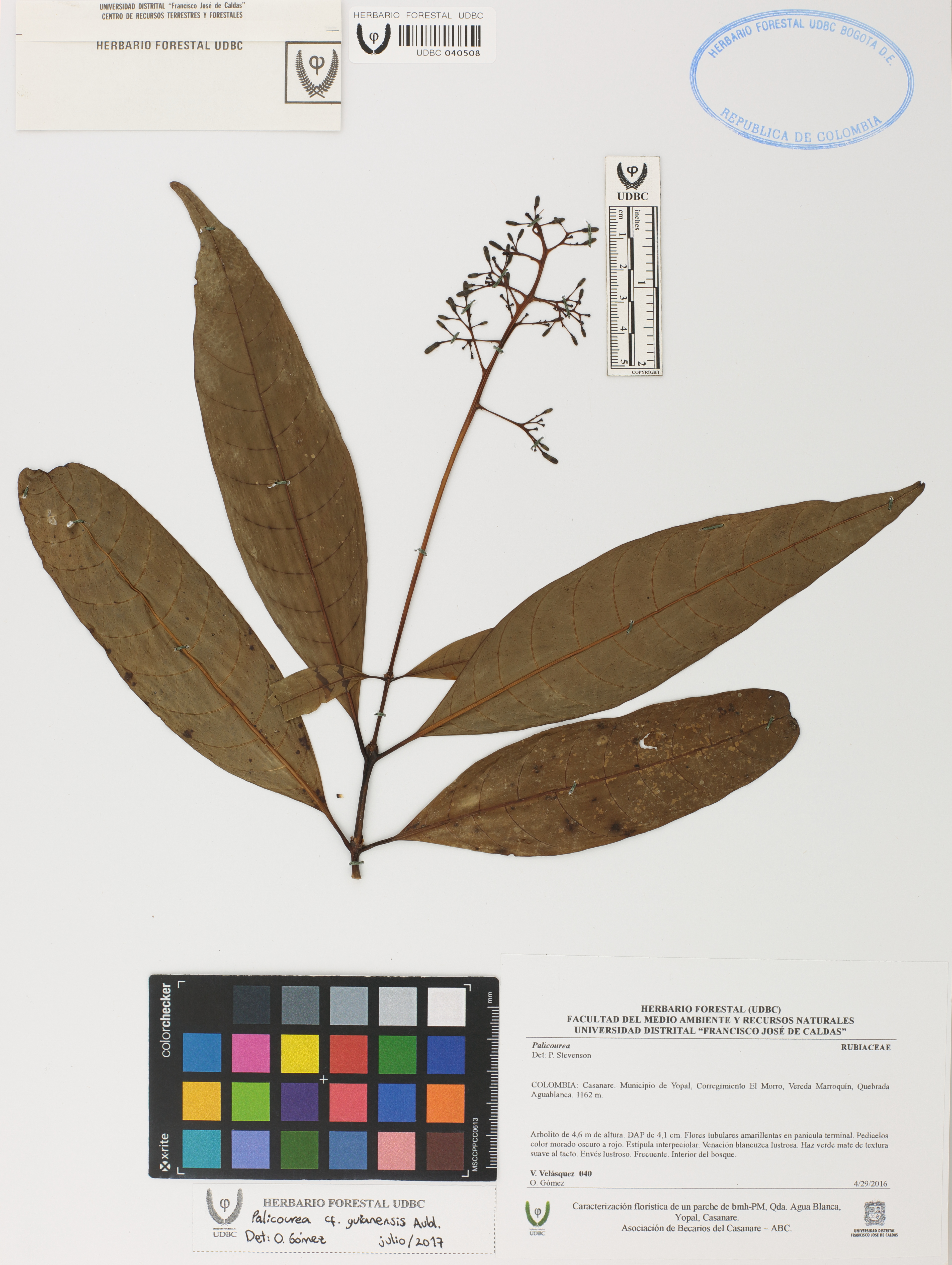 Fotografía del ejemplar Velásquez, V. 40, determinado como Palicourea guianensis en el año 2017